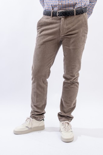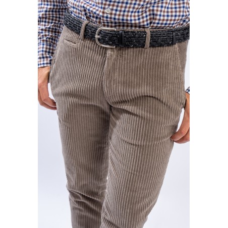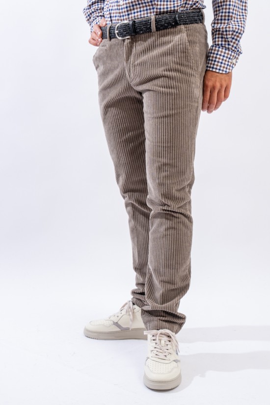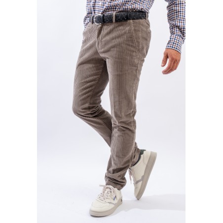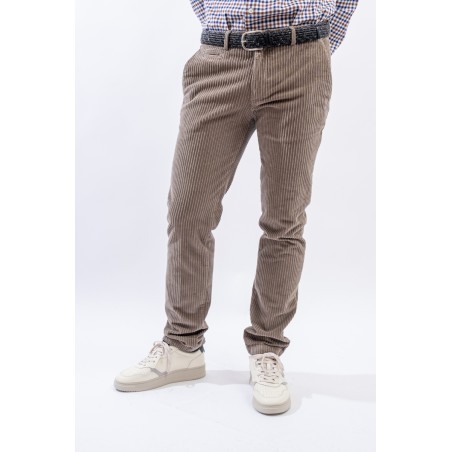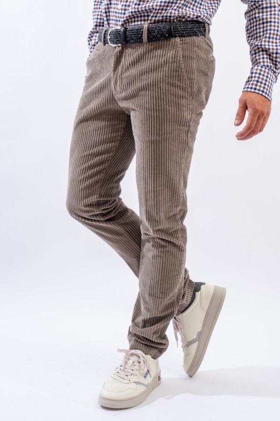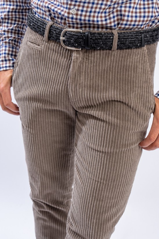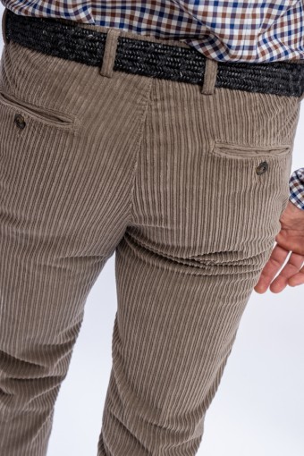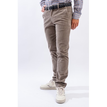 Wide ribbed trousers with velvet effect. Made of soft stretch cotton. Classic cut complete with buttoned welt pockets on the back and two open side pockets. Made in Italy.