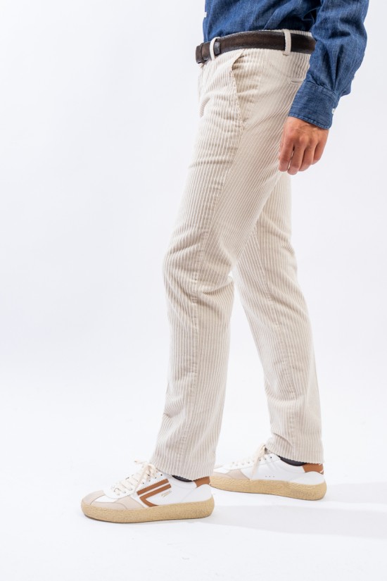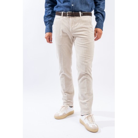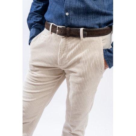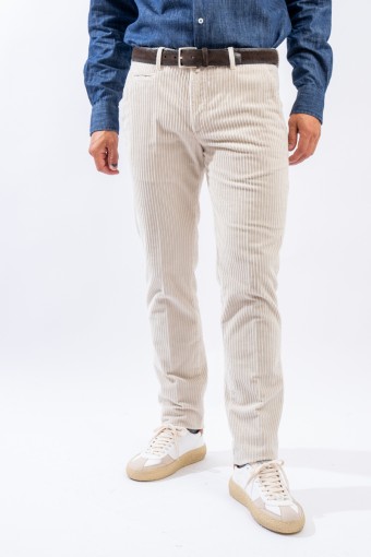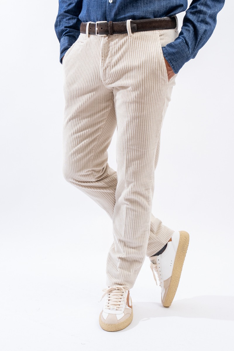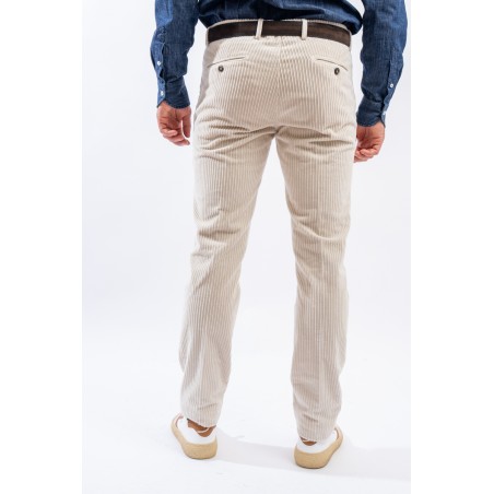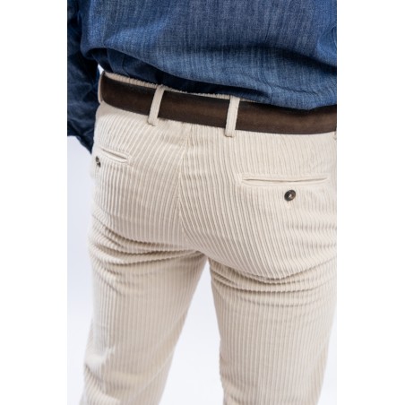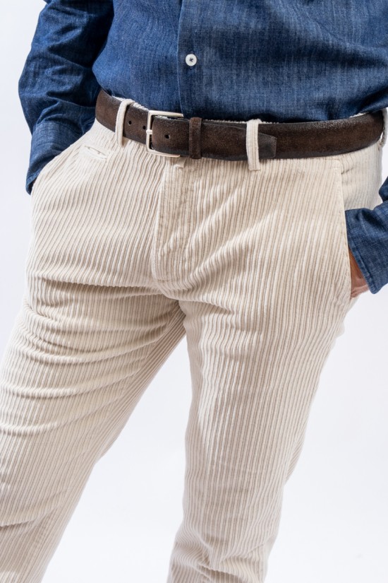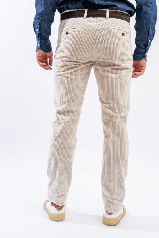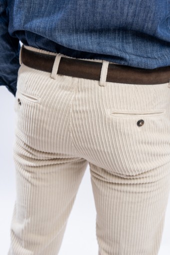 Wide ribbed trousers with velvet effect. Made of soft stretch cotton. Classic cut complete with buttoned welt pockets on the back and two open side pockets. Made in Italy.