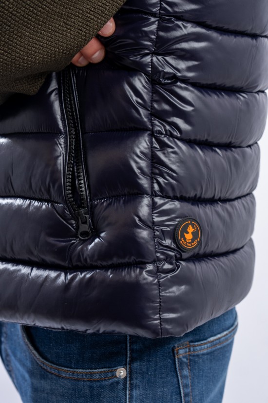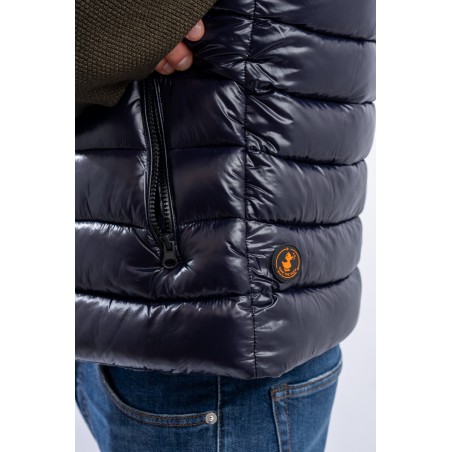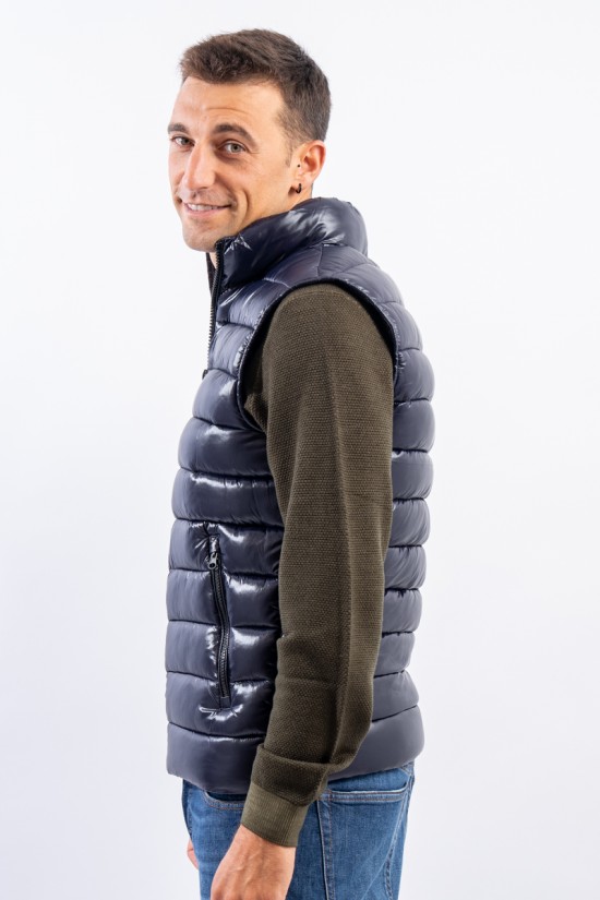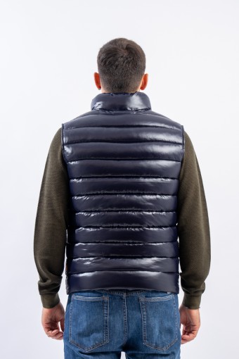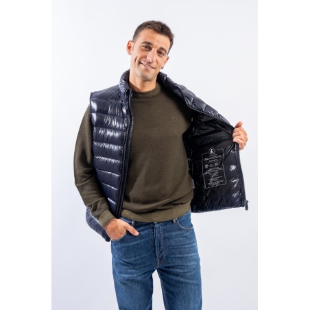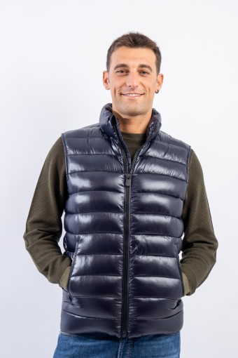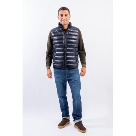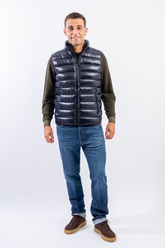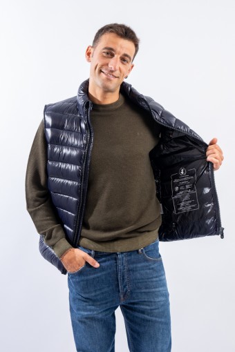 Eco-friendly vest padded with soft and lightweight Plumtech and covered in recycled nylon. Warm, breathable and water-repellent. Fullzip with logoed zipper puller and raised collar. The simplicity of the garment is characterized by the classic boudine quilting and is enhanced by the iridescent outer fabric. Side pockets closed with zip. Resealable in the practical bag supplied. Perfect for everyday use.