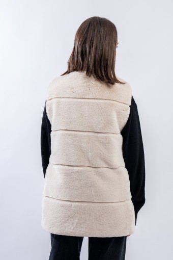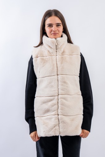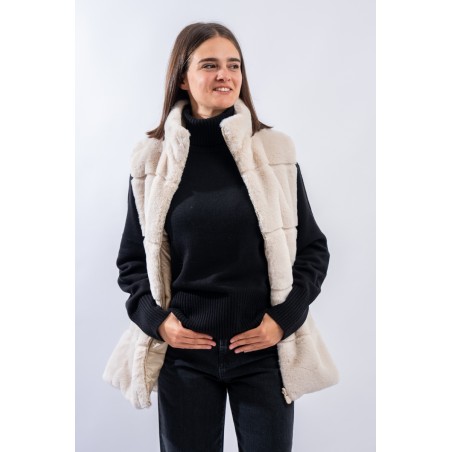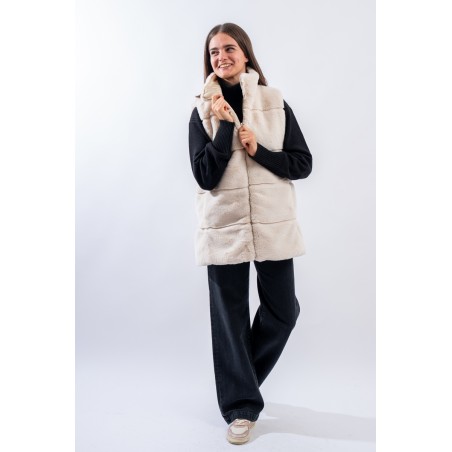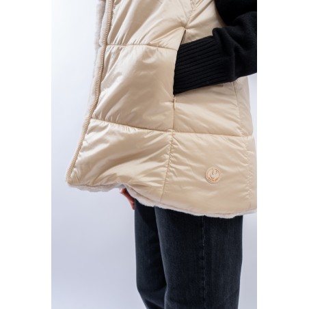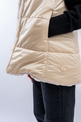 Medium-length reversible vest with enveloping stand-up collar. Made of soft teddy-effect faux fur on one side and iridescent nylon with budin quilting on the other. The plumtech padding, recycled synthetic down, is an excellent alternative to real down and ensures perfect thermal insulation. Open side pockets and central zip closure.