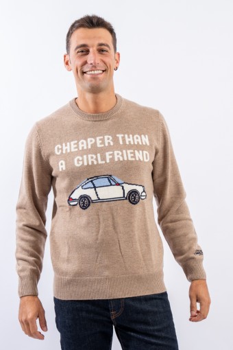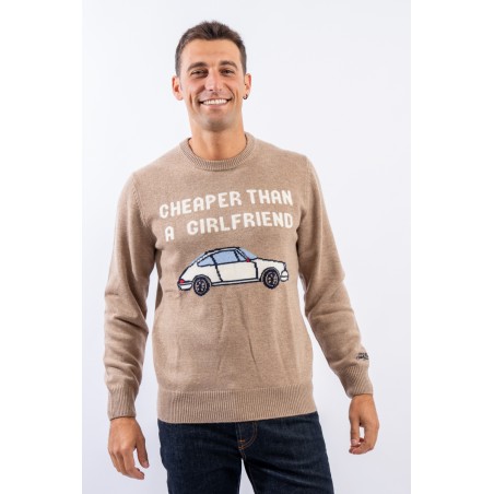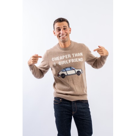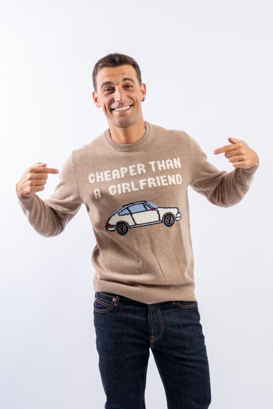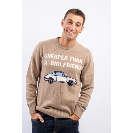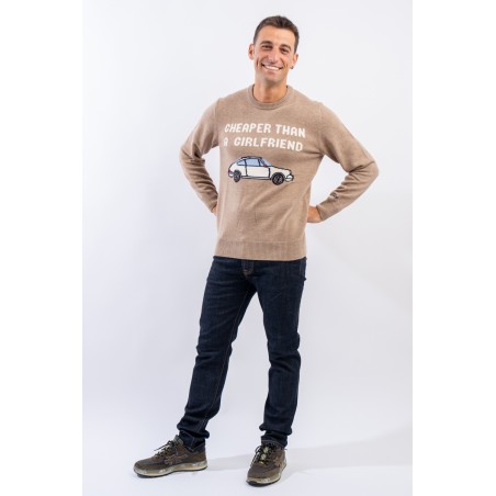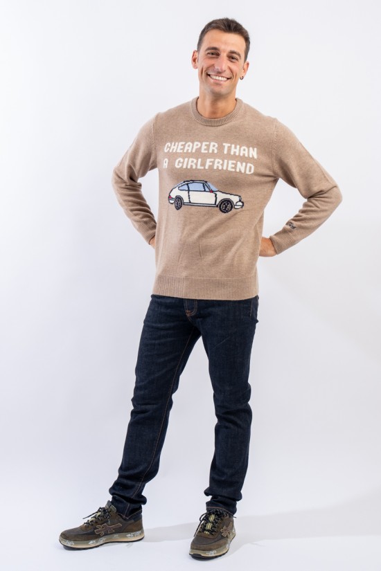 Crewneck sweater made of wool and cashmere blend. Characterized by the nice illustration with the words "Cheaper than a girlfriend" on the front. Warm and light, it is finished with a ribbed knit on the bottom, cuffs and neckline. Perfect for dressing your every look for any occasion with irony.