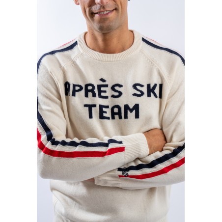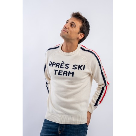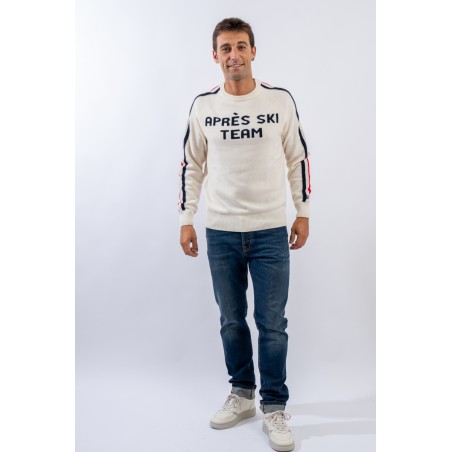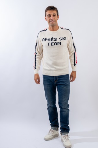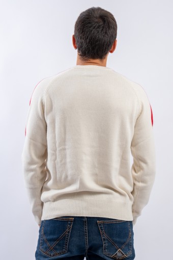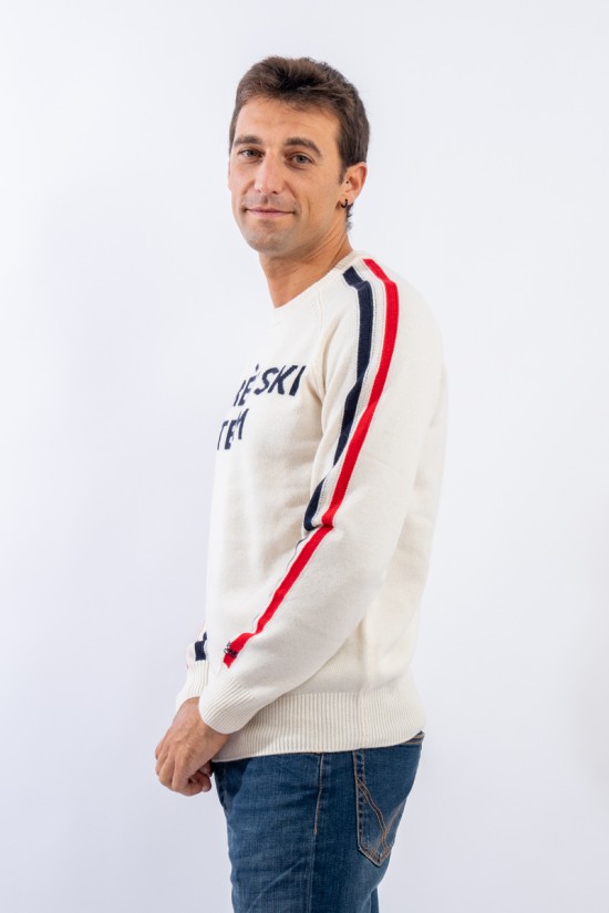 Crewneck sweater made of wool and cashmere blend. Warm and light, it is finished with a ribbed knit on the bottom, cuffs and neckline. Featuring lettering on the front and contrasting bands running along the sleeves.