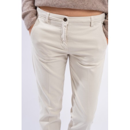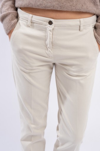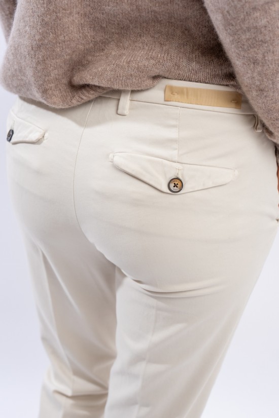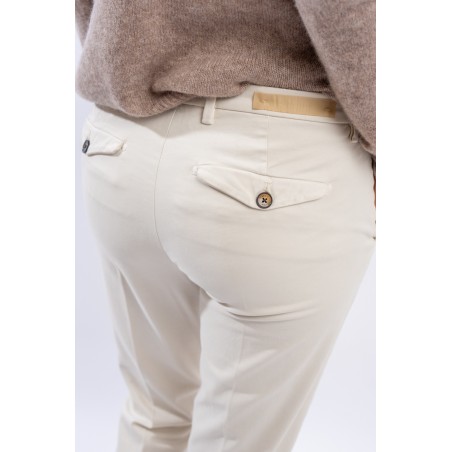 Chino trousers made of soft stretch cotton with satin effect. Slim fit with regular waist. Slanted pockets on the front and flap pockets with button on the back. Made in Italy.