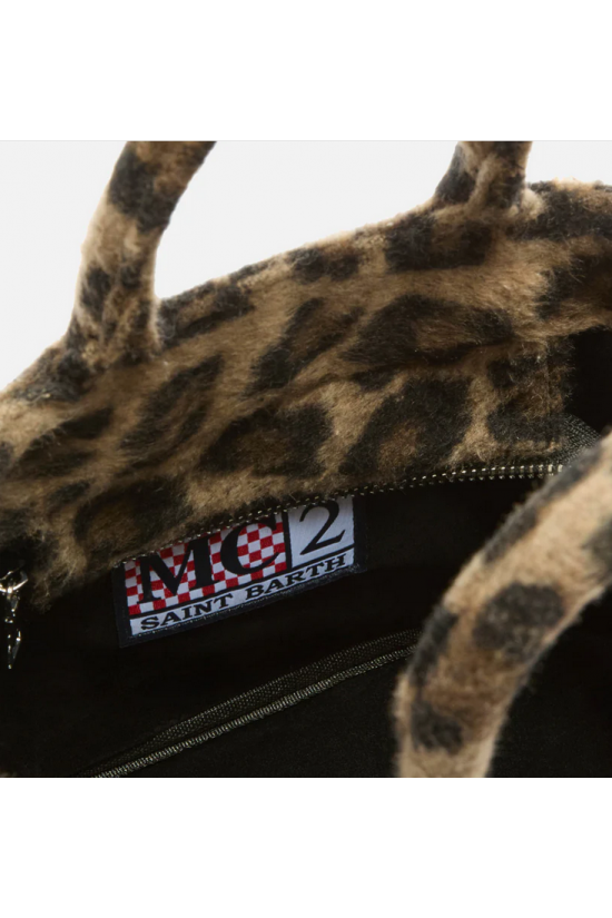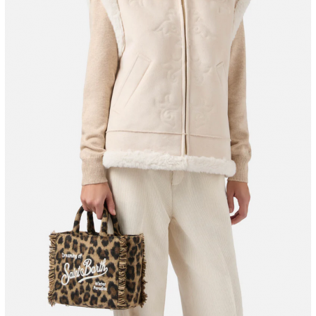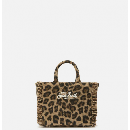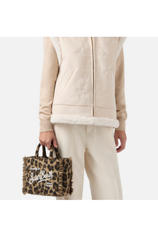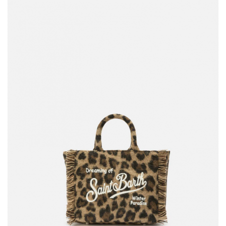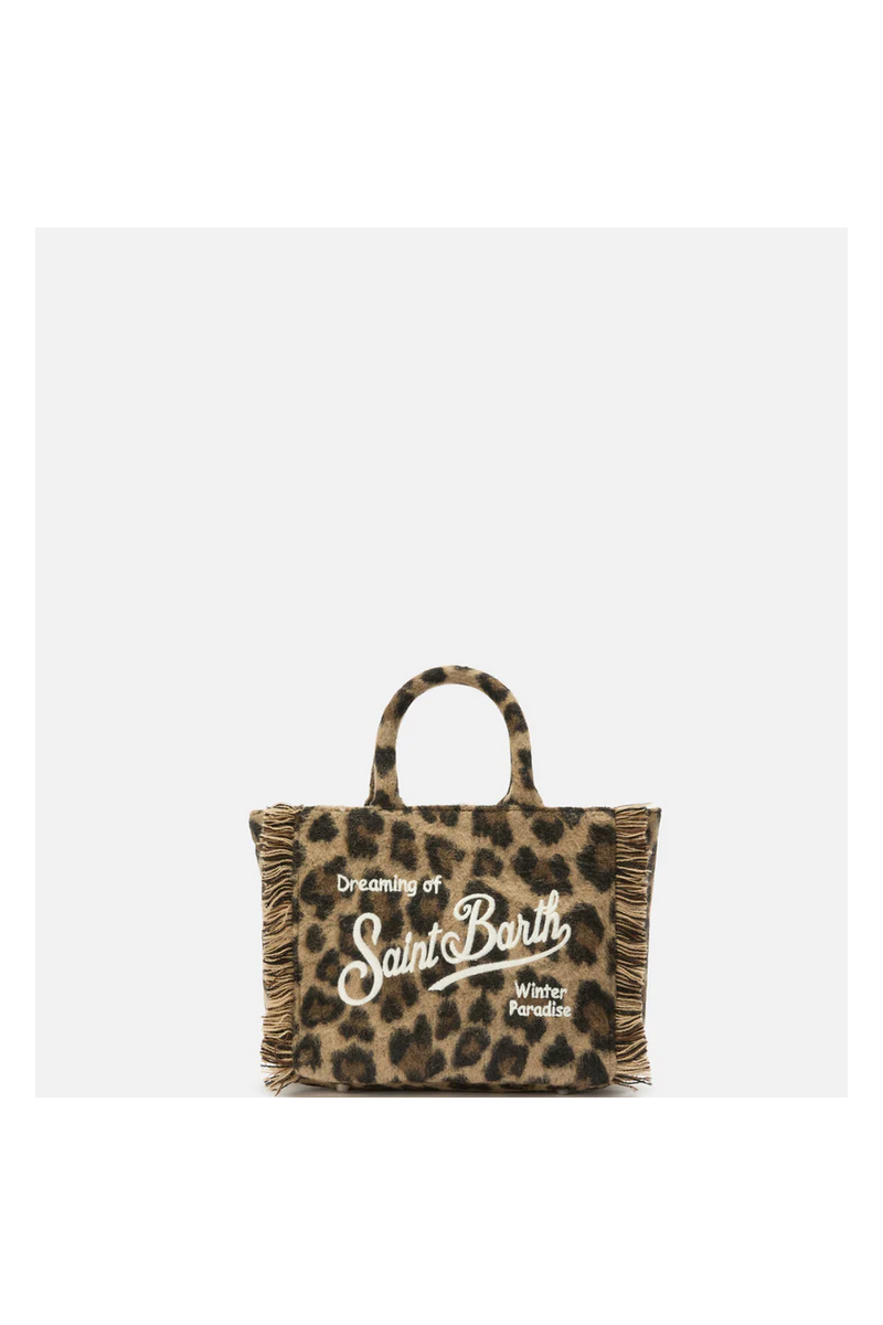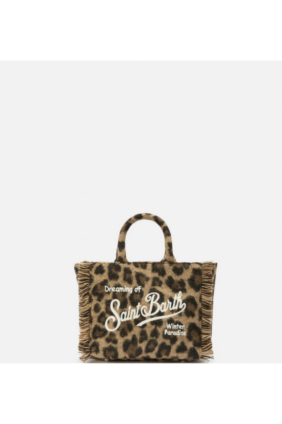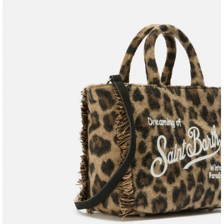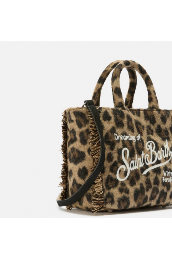 Vanity Mini is made of soft wool-effect fabric in a leopard pattern. Embellished with fringes on the edges and contrasting embroidered "Dreaming of Saint Barth Winter Paradise". Main closure with practical zip. Equipped with two handles and adjustable and removable fabric shoulder strap. Inside there are two comfortable pockets. Chic and soft, it is the right accessory to carry the essentials with style always with you.
