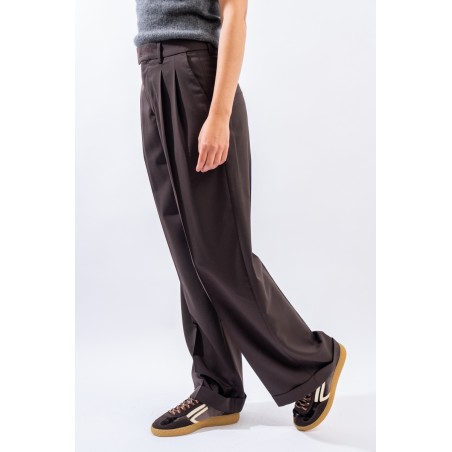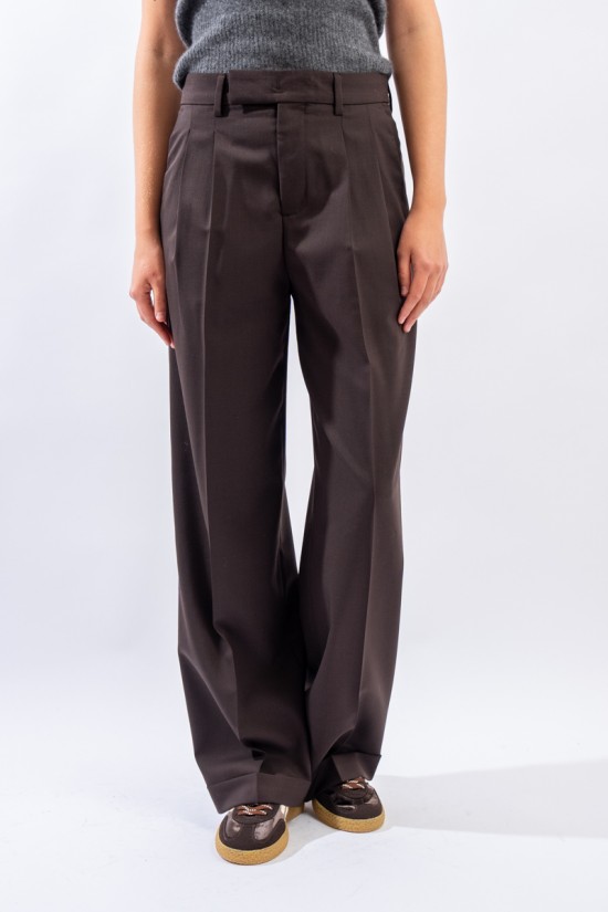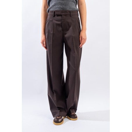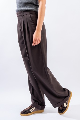 Trousers with a formal taste made fresh and contemporary by the updated cut and double pleats. Made of chocolate-brown wool, it is in perfect harmony with the winter trend. It has a wide palazzo leg and a turn-up at the bottom. Zip and button closure, belt loops. Slanted pockets on the front and welt pockets on the back. Carefully made in Italy.