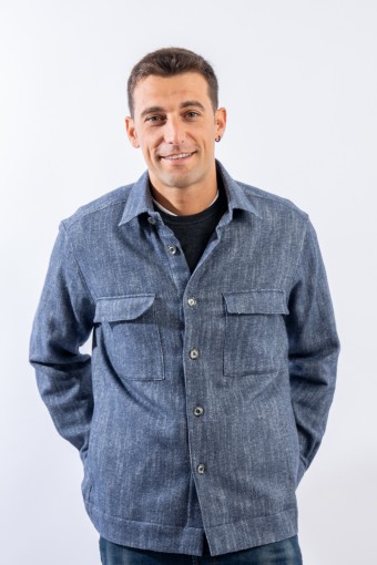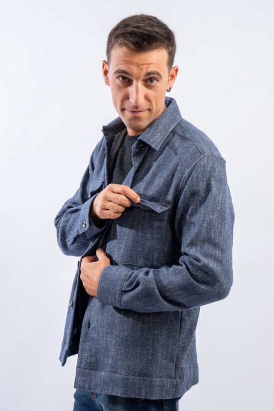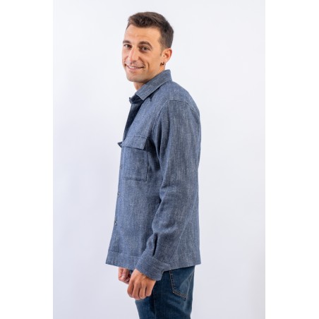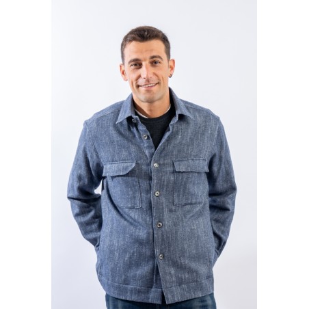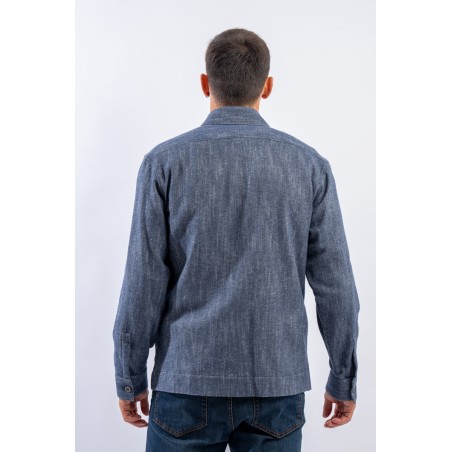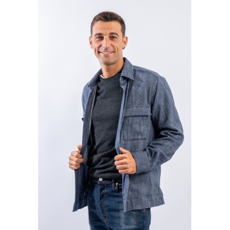 Shirt jacket made of cotton and wool blend. Warm and soft, it stands out for its sporty and lived-in effect workmanship. French collar and classic central buttoning enriched by the application of two bellows pockets on the chest. Soft and comfortable lines for a softened and casual look. Comfortable fit for a versatile garment ideal in mid-seasons as a jacket or as a warm complement in winter.
