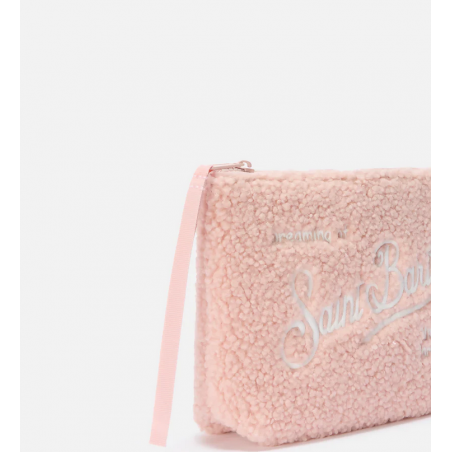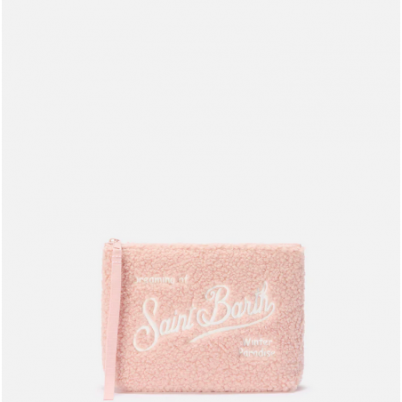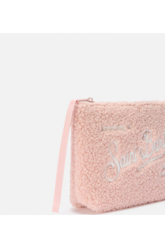 Saint Barth Aline clutch bag made of soft shearling-effect fabric embellished with the contrasting embroidered writing "Dreaming of Saint Barth Winter Paradise". Zip closure and grosgrain wrist loop. Refined clutch bag with a warm and comfortable look.