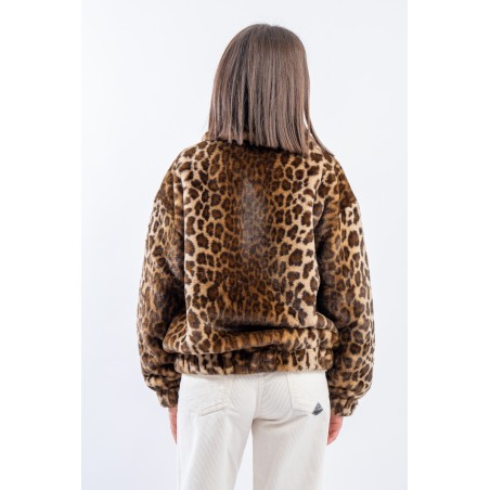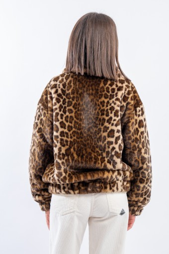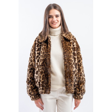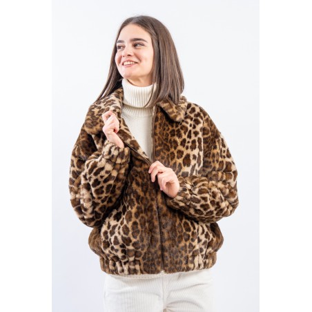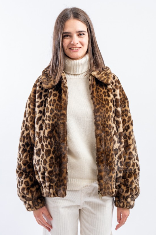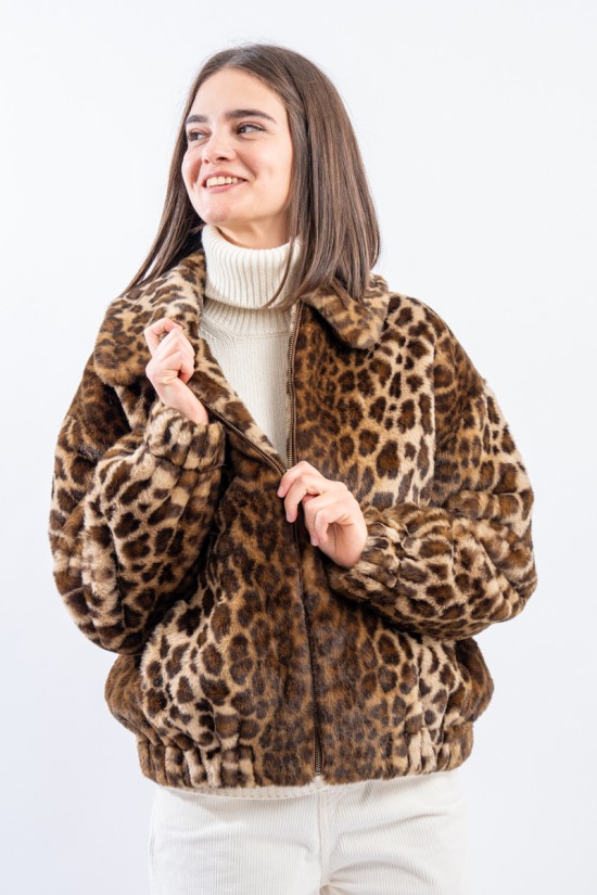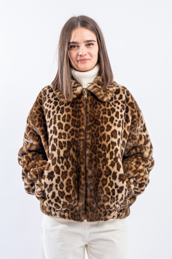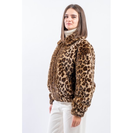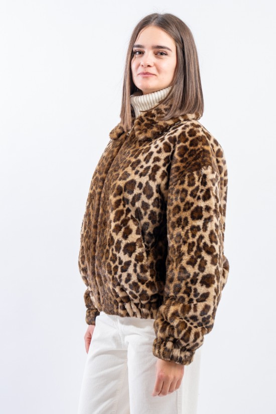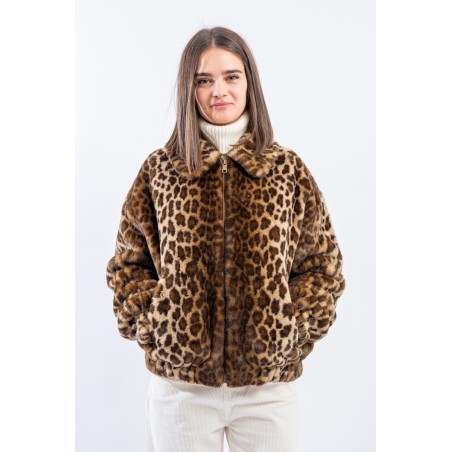 Soft faux fur bomber jacket with all-over animal print. It features a padded collar, elasticated cuffs and hem. Zip closure and side pockets. Perfect for adding a touch of grit to your outfits!