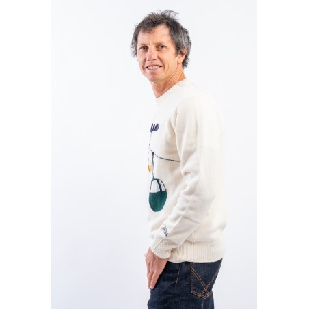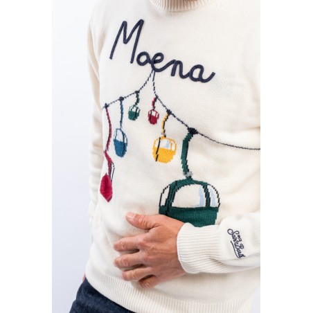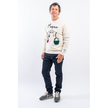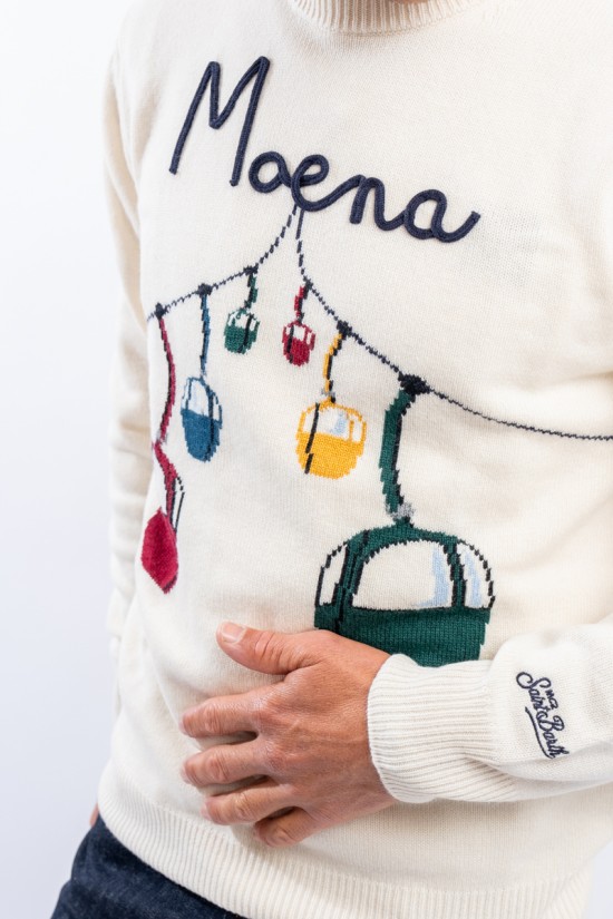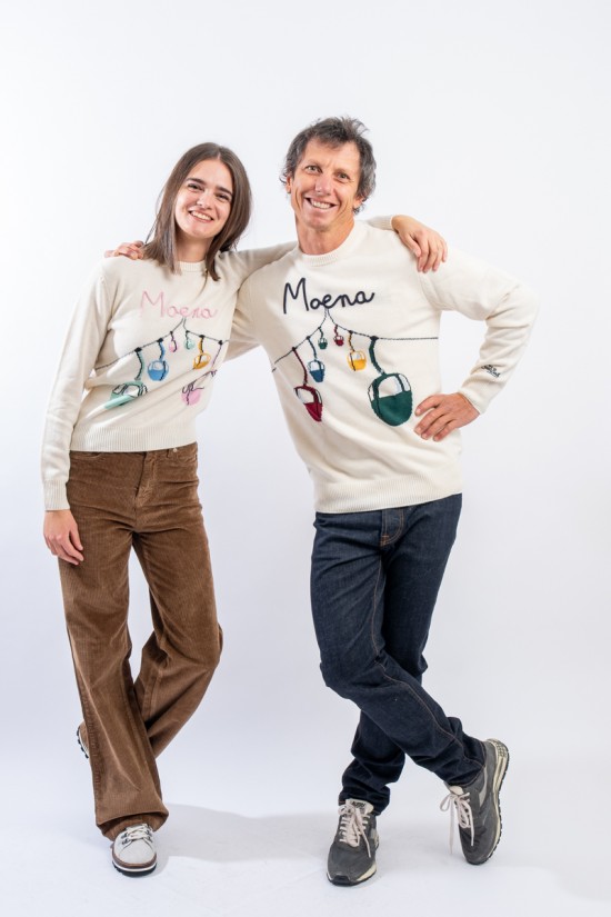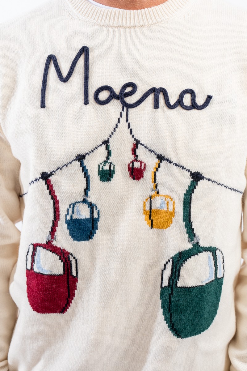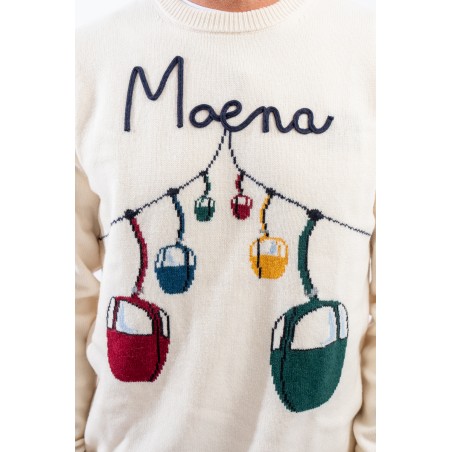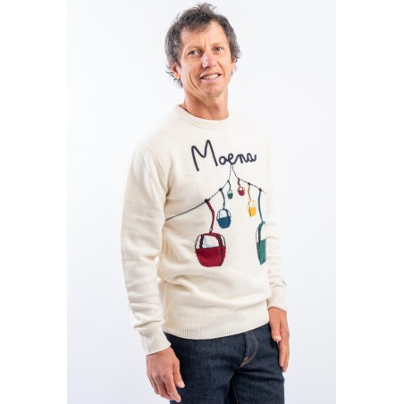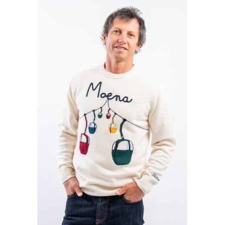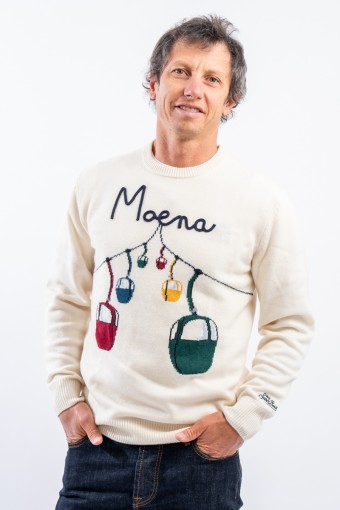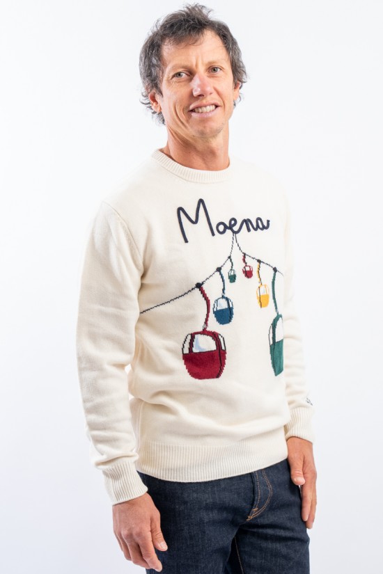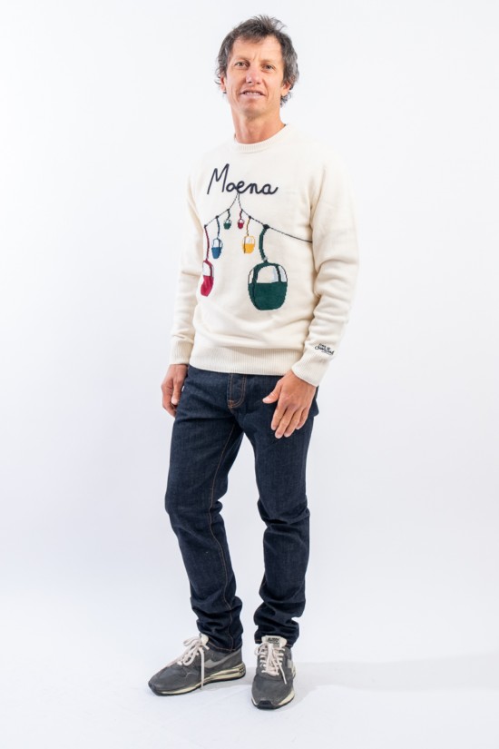 "Moena" jersey, suspended between sky and mountains! Exclusively at Livio Sport you can find the personalized jersey with embossed embroidery "Moena". Made of a fine wool and cashmere yarn, it is perfect for those who carry the magic of the mountains and the sweetness of their memories in their hearts. The Moena jacquard postcard depicts a colourful cable car that climbs through the Dolomites and recalls the lively atmosphere of Moena, between nature, sport and relaxation. Wear a memory, not just a shirt!