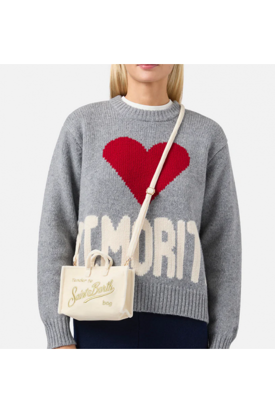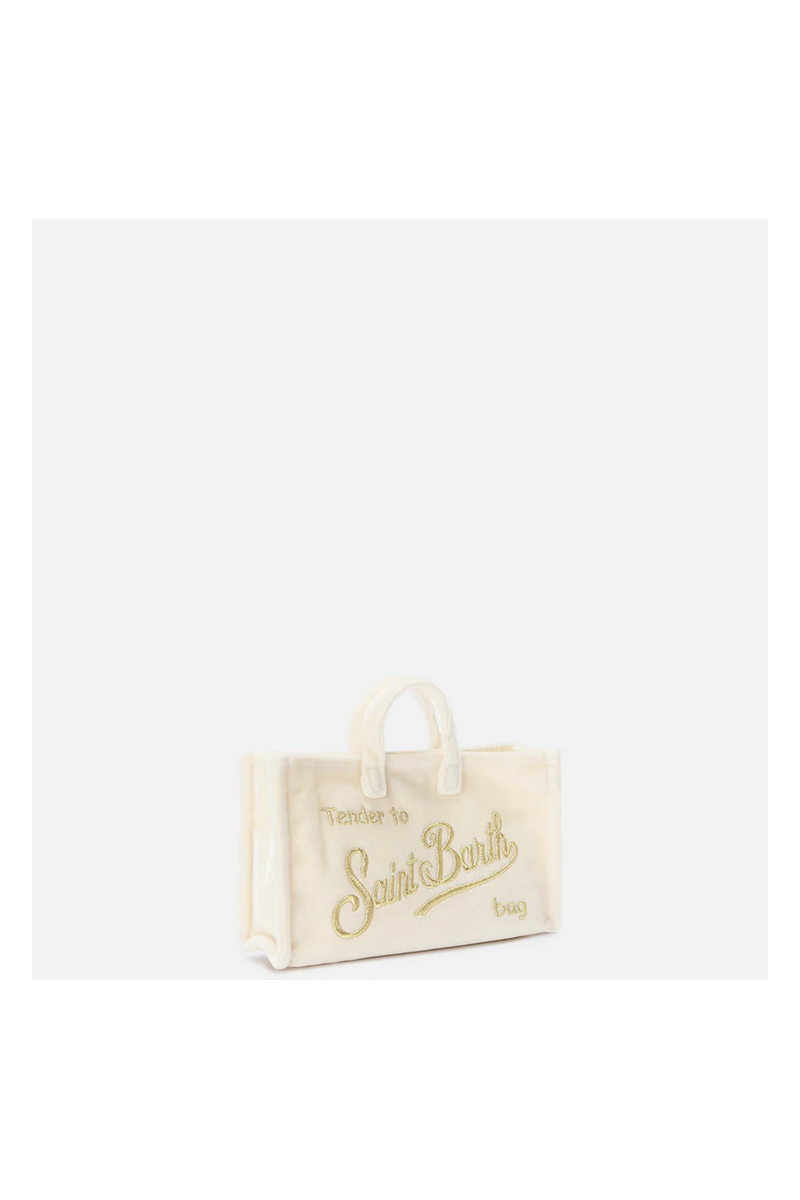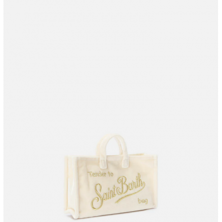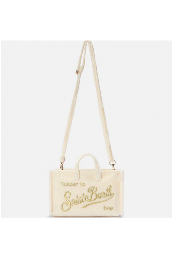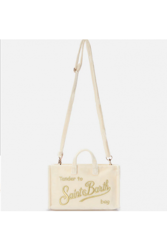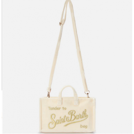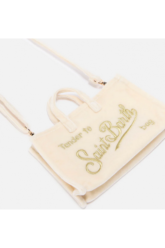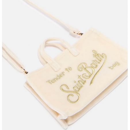 The Velvet Phone Bag is made of soft chenille-effect fabric, embellished with the words embroidered in luminous yarn "Tender to Saint Barth bag". Magnetic closure with handles and shoulder strap. Refined, compact and soft, it is the perfect accessory to carry the essentials always with you