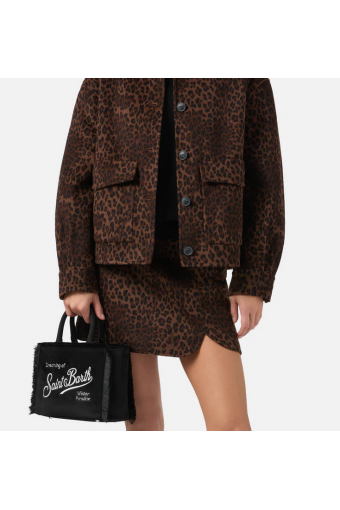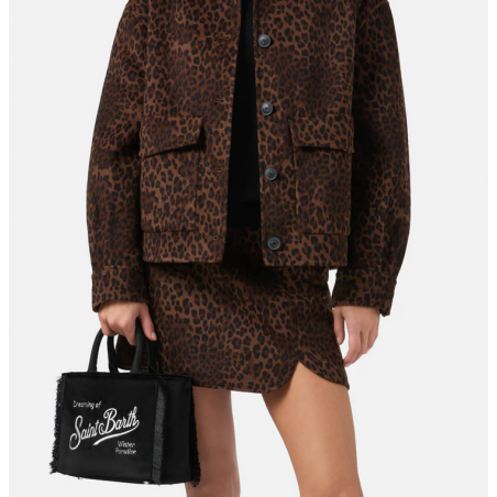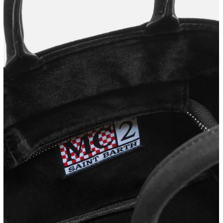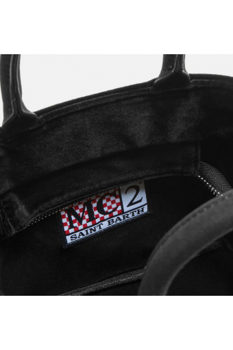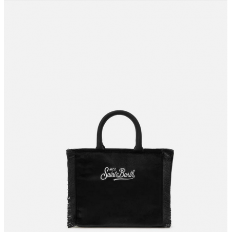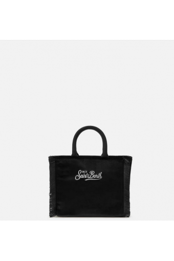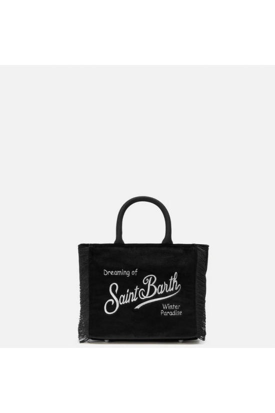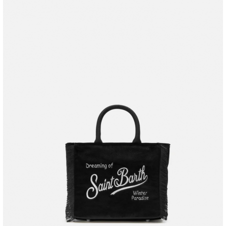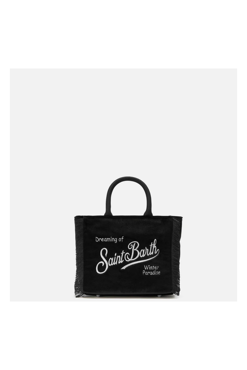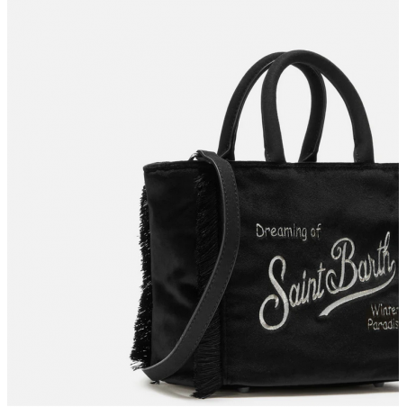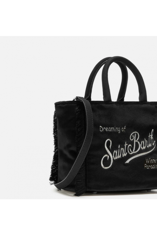 Vanity Mini Velvet is made of soft velvet-effect fabric. Embellished with fringes on the edges and the writing embroidered with luminous "Dreaming of Saint Barth Winter Paradise" yarn. Main closure with practical zip. Equipped with two tone-on-tone faux suede handles and adjustable and removable fabric shoulder strap. Inside there are two comfortable pockets. Chic and soft, it is the right accessory to carry the essentials with style always with you.