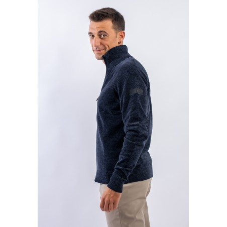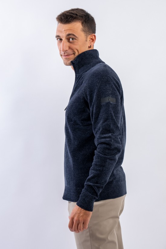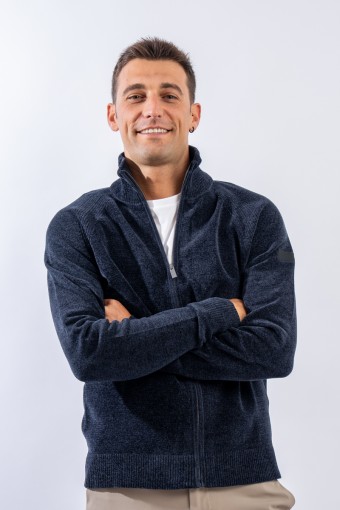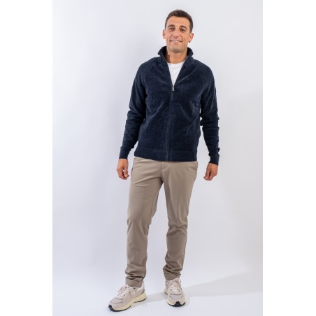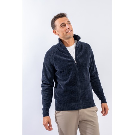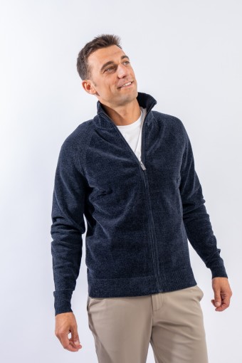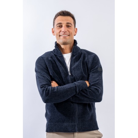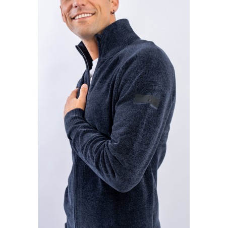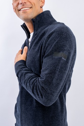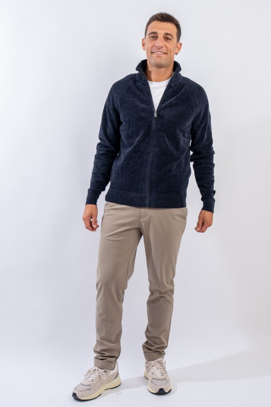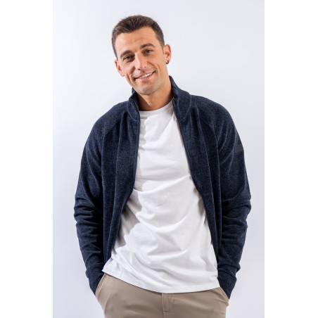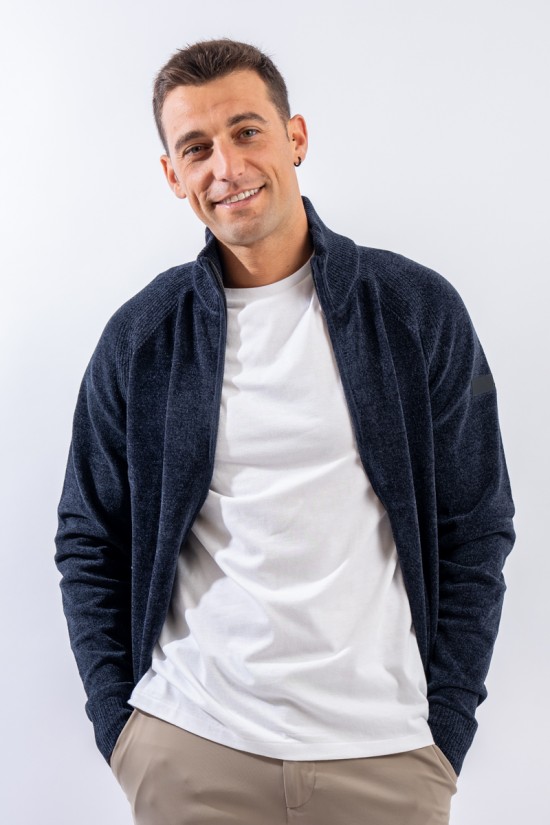 Essential design enhanced by the light recreated by the stretch chenille fabric. Comfortable thanks to the raglan sleeve and regular fit. The full zip closure is practical and versatile, which allows it to be better adapted to the weather conditions. Finished with a ribbed knit on the high collar, cuffs and hem. Passepartout for a wide selection of looks, from the most casual to the most sophisticated.