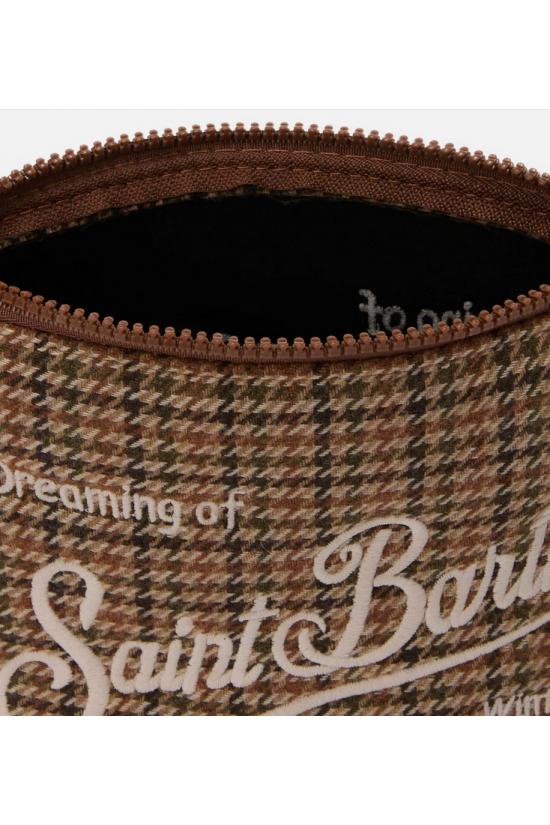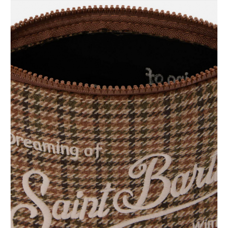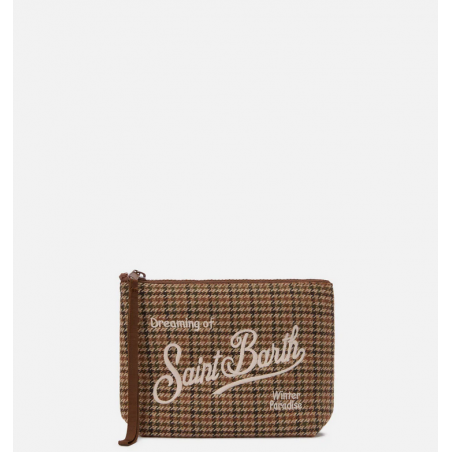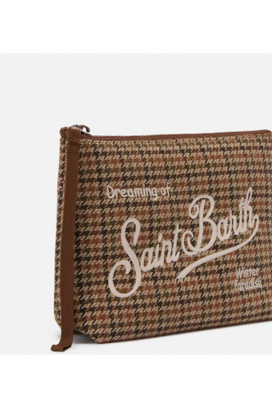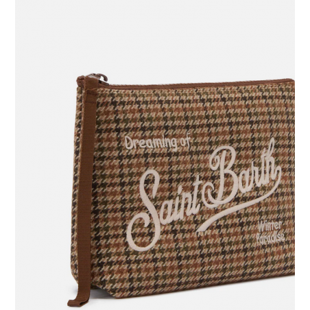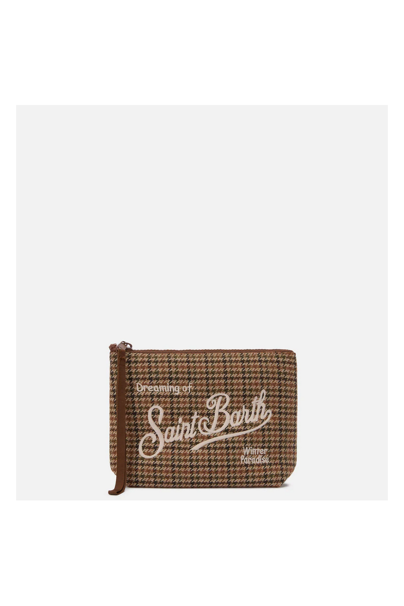 Pochette Parisenne by Saint Barth, made of soft wool-effect fabric in houndstooth pattern. Embellished with the contrasting embroidered "Dreaming of Saint Barth Winter Paradise" lettering. Main closure with metal zip and grosgrain wrist loop. Elegant and versatile thanks to a trendy look, to store the essentials in style.