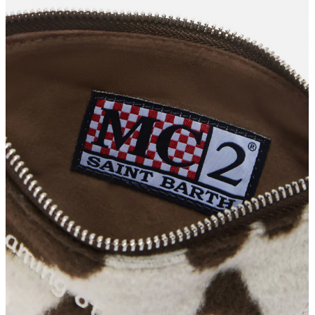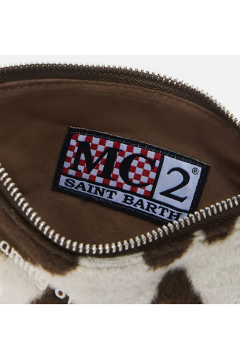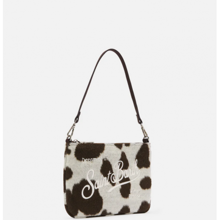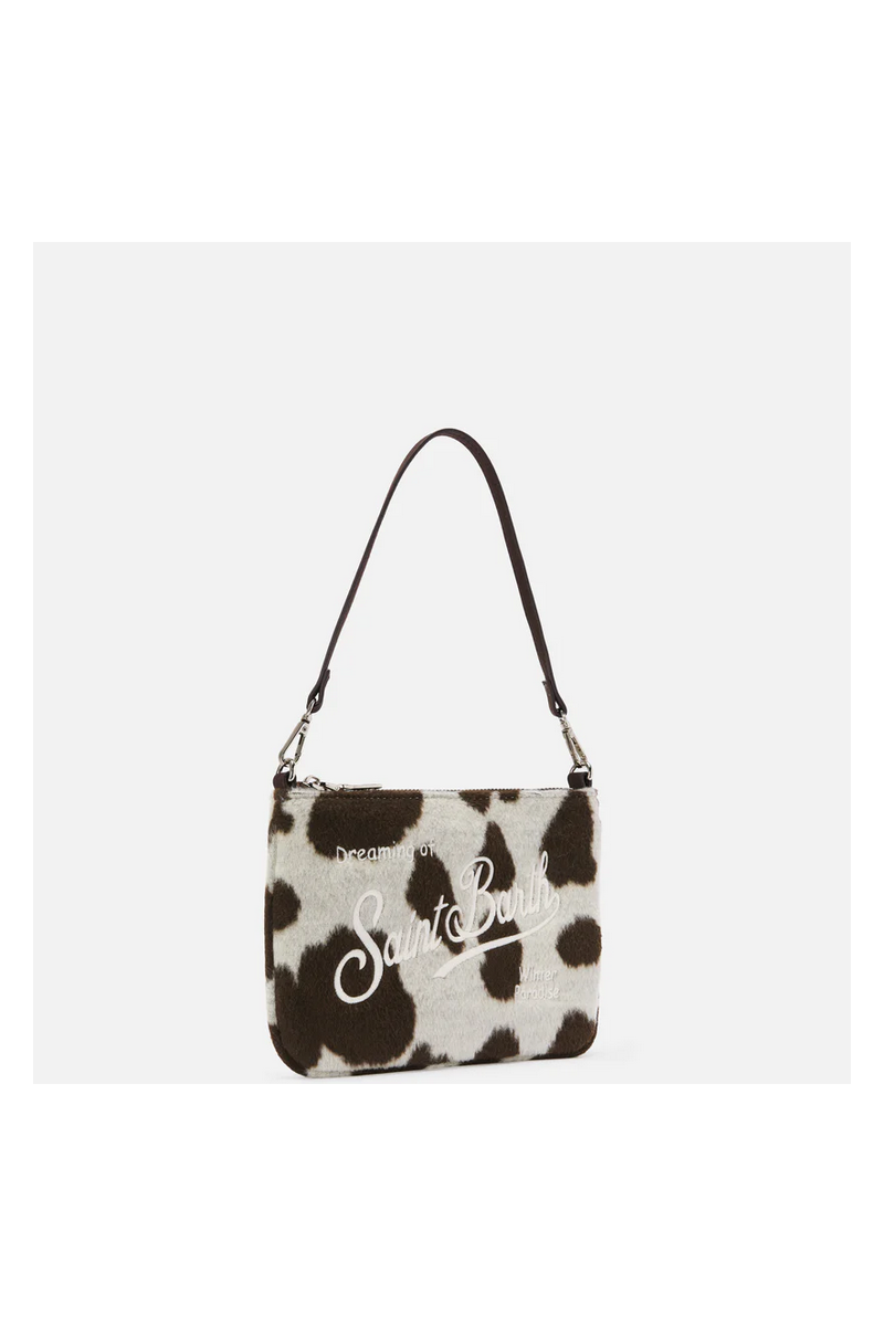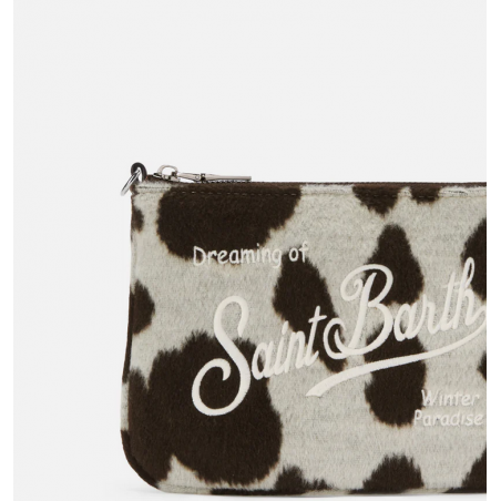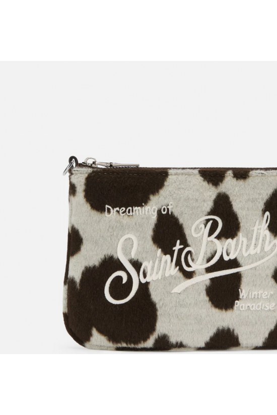 Pochette Parisienne by Saint Barth, made of soft wool-effect fabric in a cow pattern. Embellished with the contrasting embroidered "Dreaming of Saint Barth Winter Paradise" lettering. Main closure with metal zip. Equipped with an eco-leather shoulder strap so it can also be worn on the shoulder. Trendy looks to store the essentials in style.