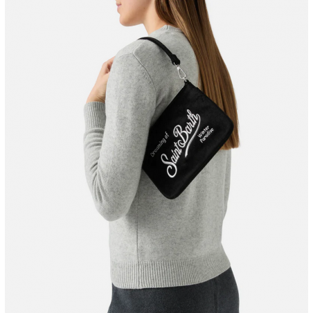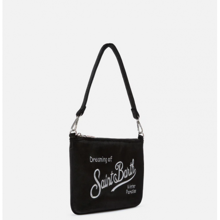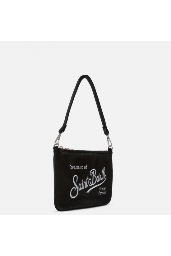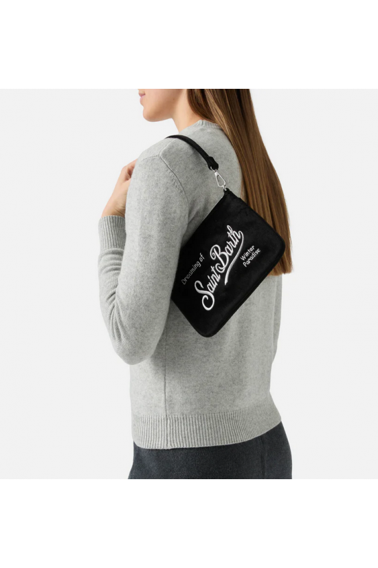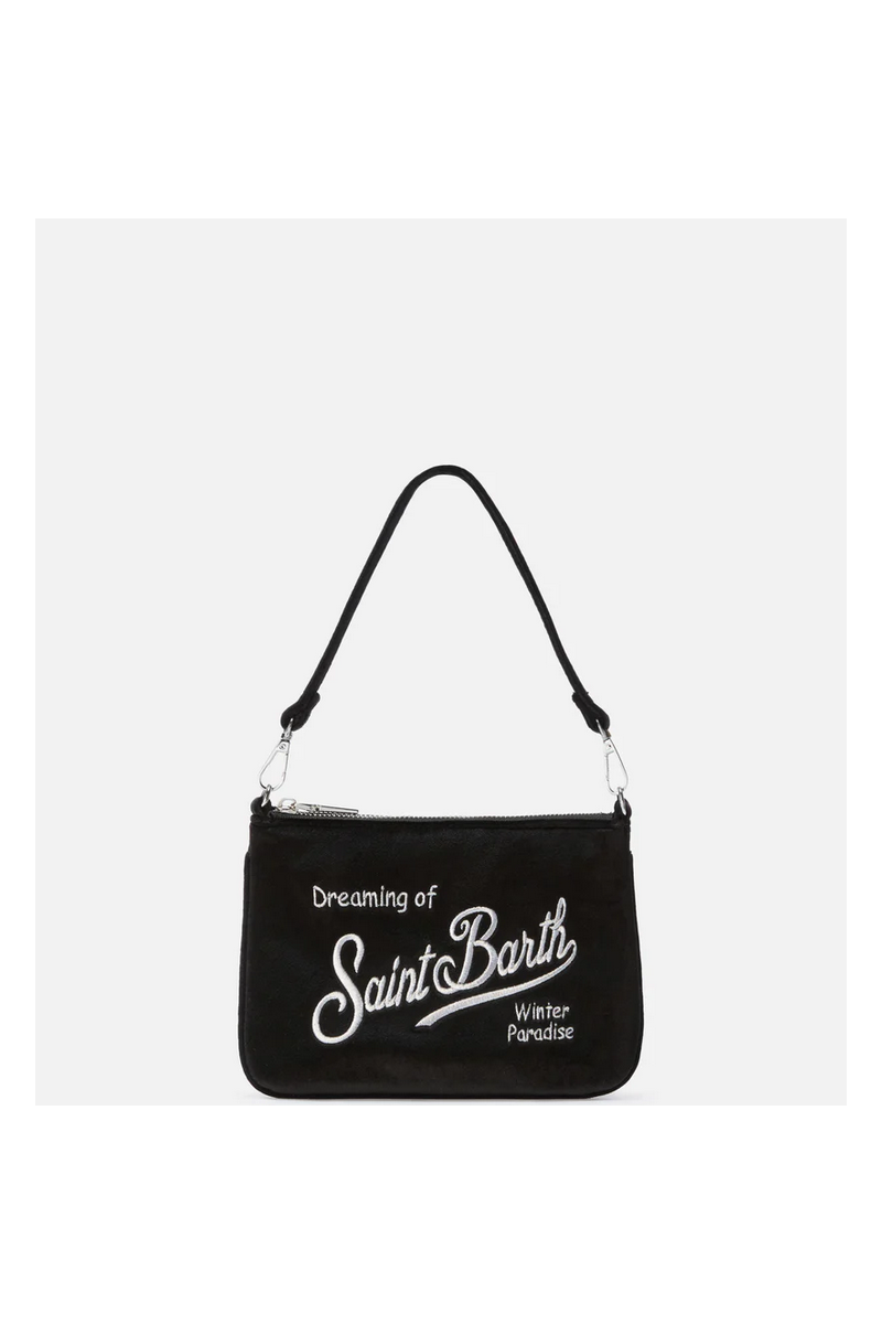 The Parisenne mini velvet clutch bag is crafted from soft chenille-effect fabric, embellished with contrasting embroidered "Dreaming of Saint Barth Winter Paradise" lettering in diamond yarn. Shoulder bag with metal zip closure. Refined, soft and chic, it is the perfect accessory to carry the essentials with you at all times.