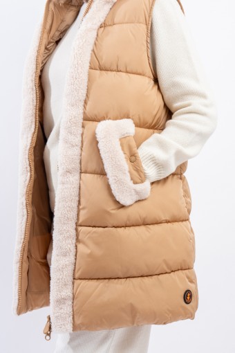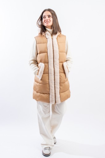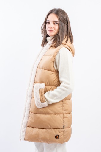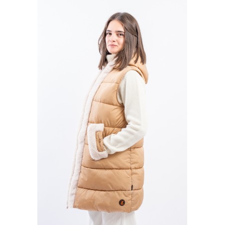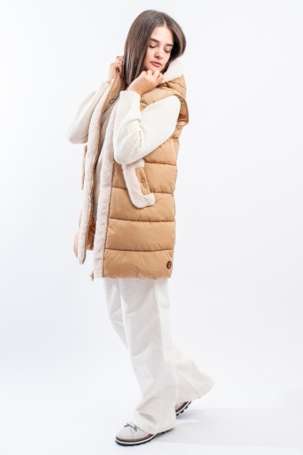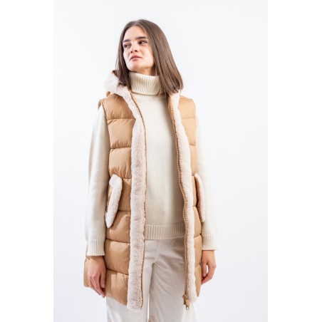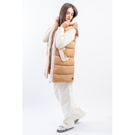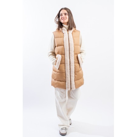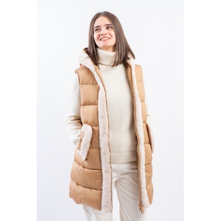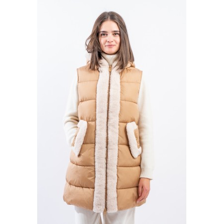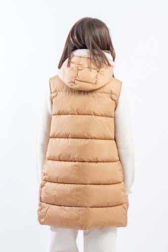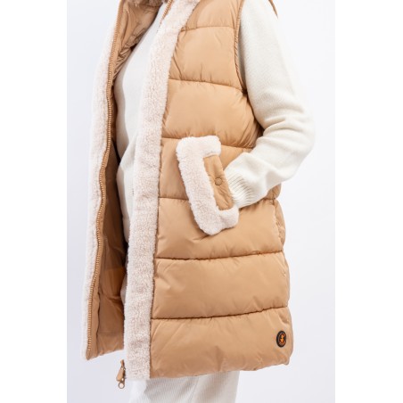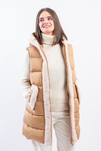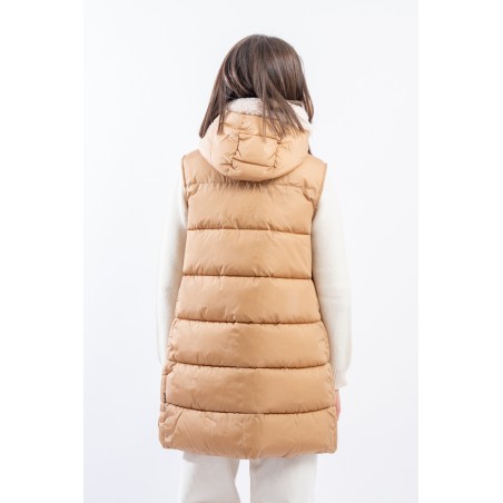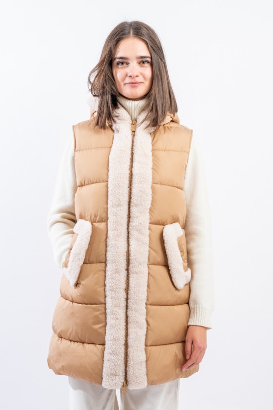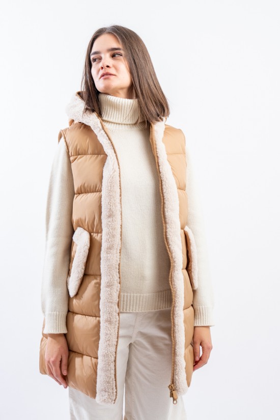 Maxi hooded vest embellished with teddy profiles. It features a wraparound hood, two-way zip and side pockets with snap buttons. The ecological padding in plumtech guarantees excellent insulation and optimal heat retention. Lively and jaunty, the perfect garment to play down your every outfit.