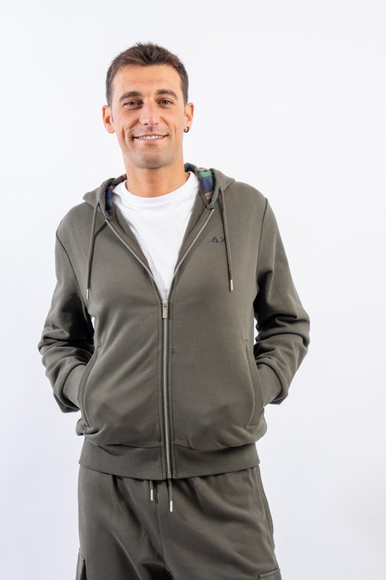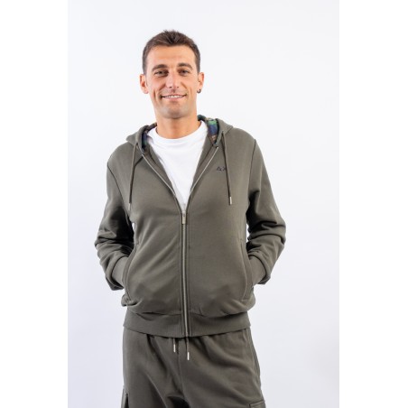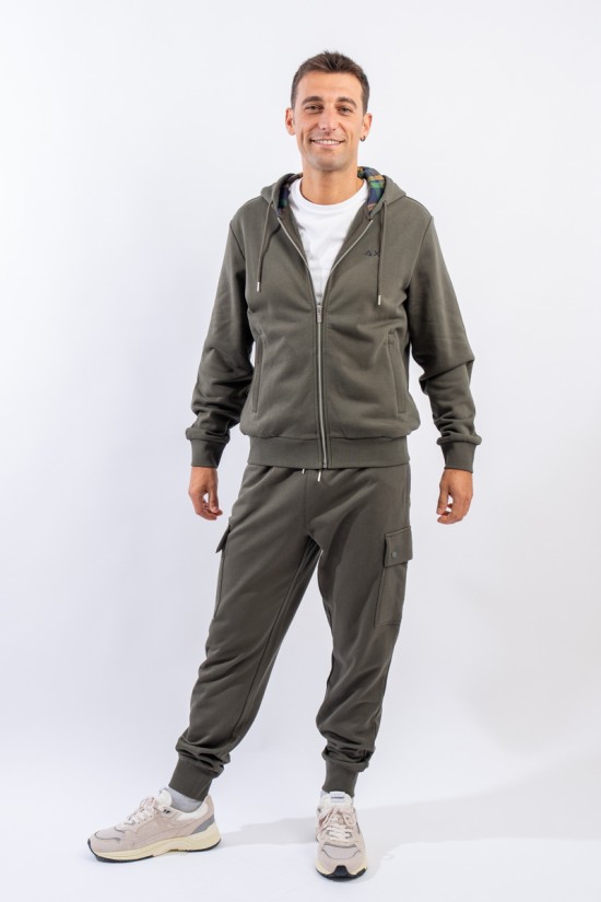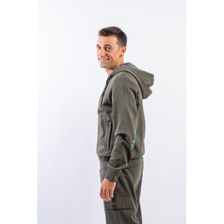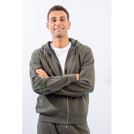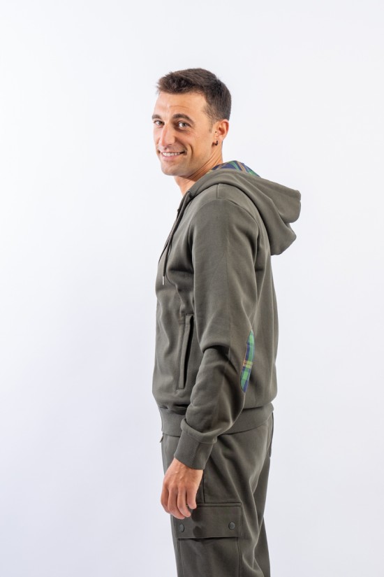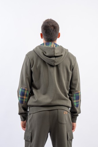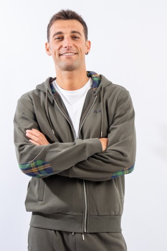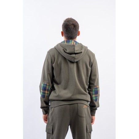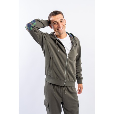 Full zip sweatshirt with a slightly fleece hooded inside. The bottom and cuffs are worked in tight and elasticated ribs. The hood is doubled in check fabric recalled on the patches behind the elbow. Regular fit. Comfortable and warm, it is perfect coordinated with trousers of the same line.