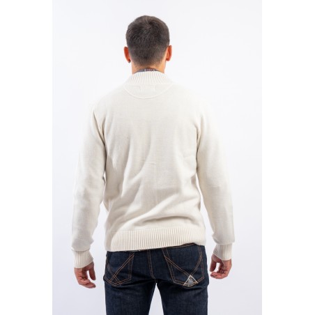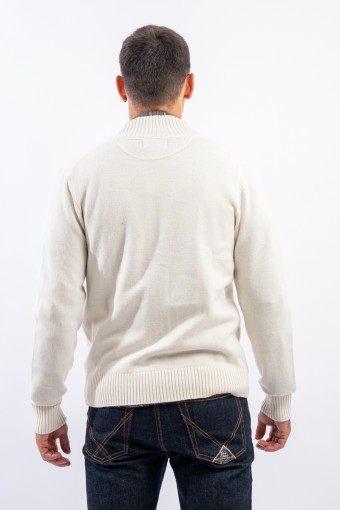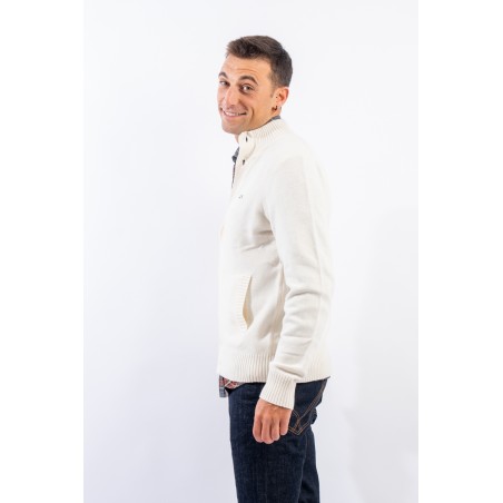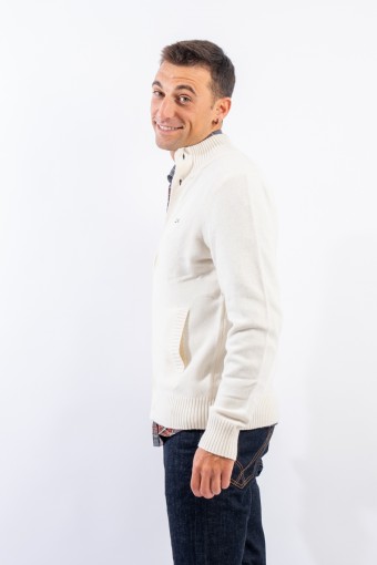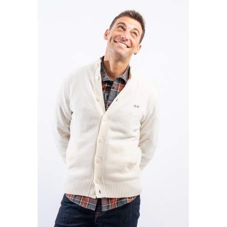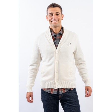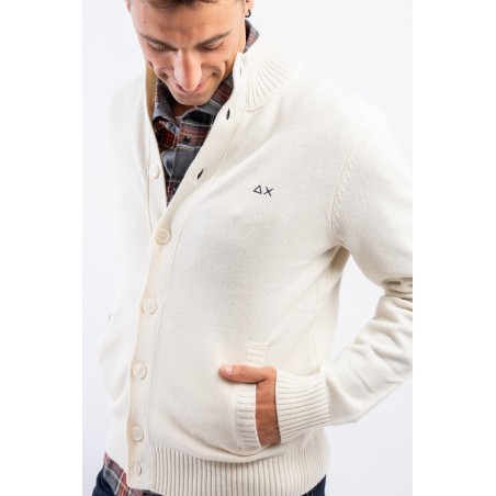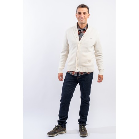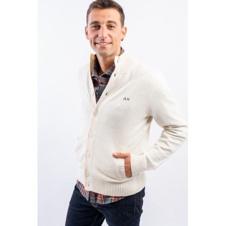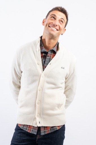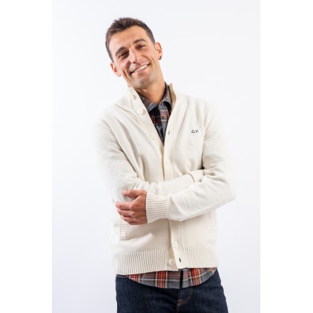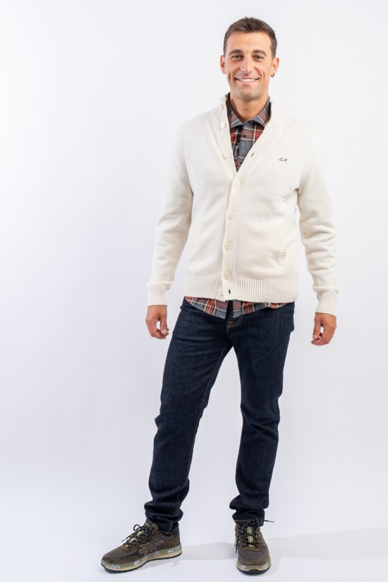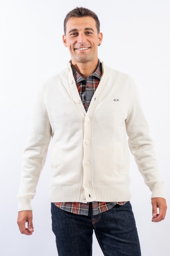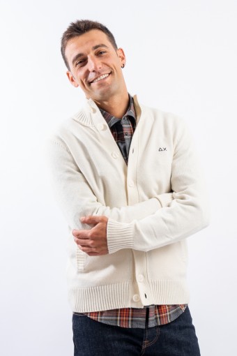 Warm and soft cardigan made of merino wool and cashmere blend. The classic line is revisited with a wide rib knit on the collar, cuffs and hem. Tone-on-tone central buttoning. Regular fit for optimal comfort.