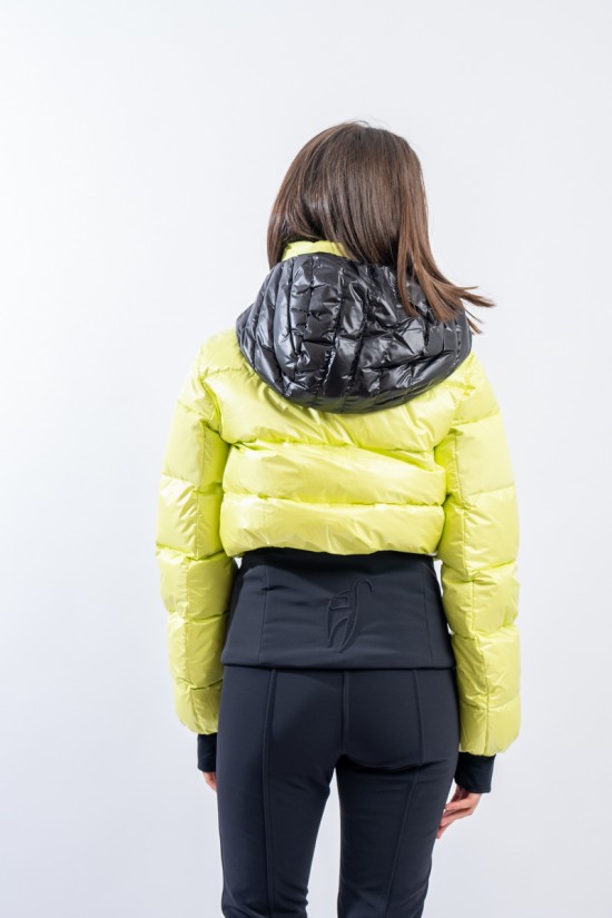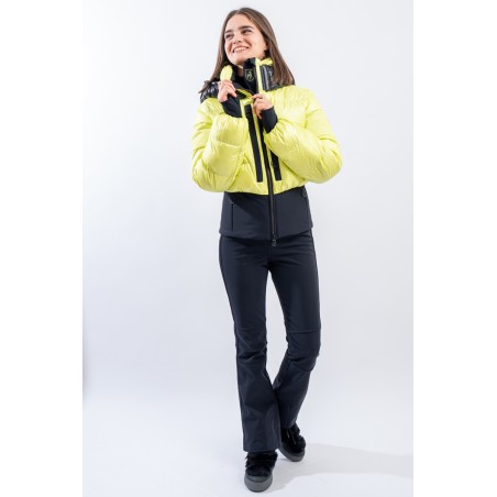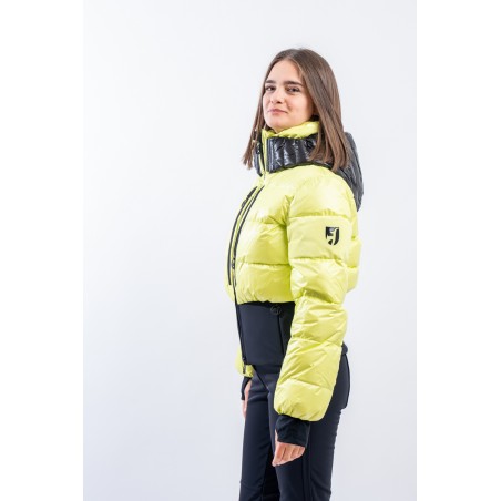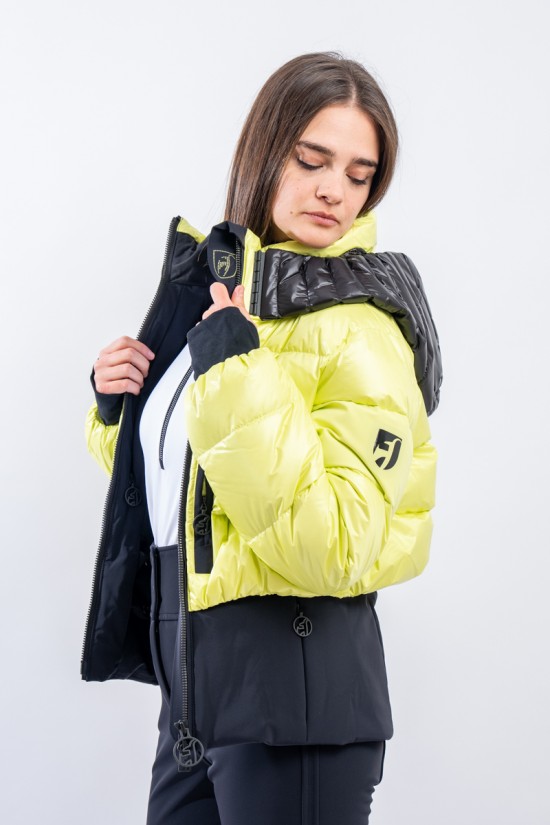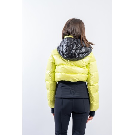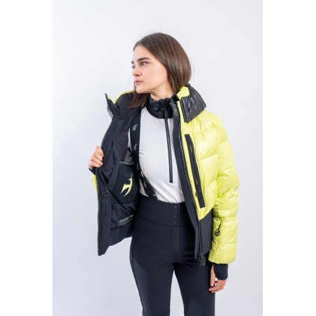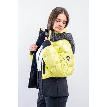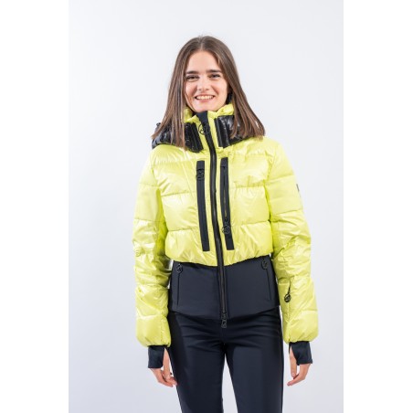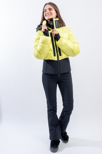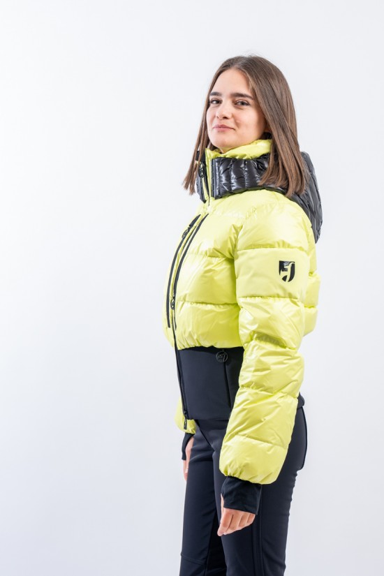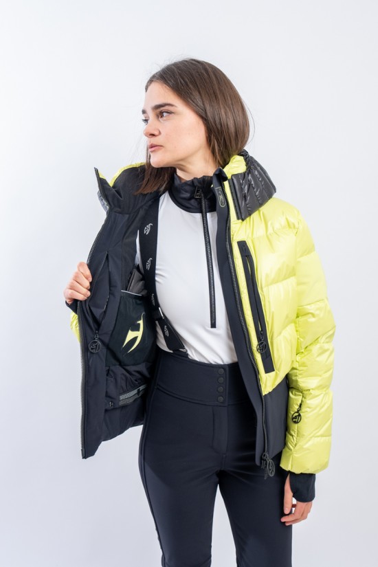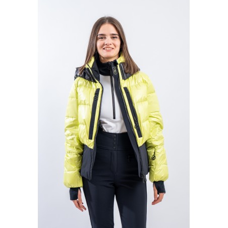 Contemporary cut and puffy-effect volumes enhanced by the elasticated and fitted waistband, for a new and functional bomber look. Bernadette is the TONI SAILER ski jacket designed for the snow or for relaxing on cold mountain days. Filled with down and , it is warm and insulating. The membrane coupled to the fabric makes the jacket highly waterproof and breathable. The hood and the various contrasting color details give dynamism and originality to the look. Versatile and equipped with every anti-snow option, it is the perfect jacket for the demanding skier who does not want to give up style on the slopes.