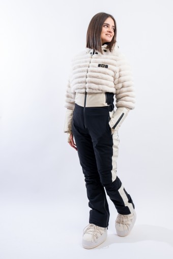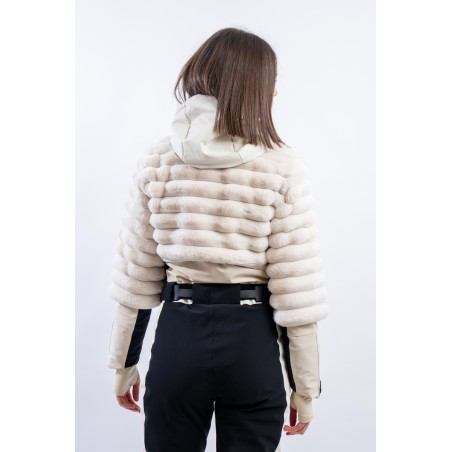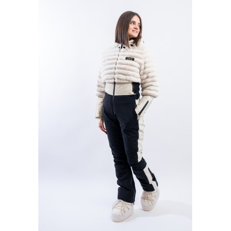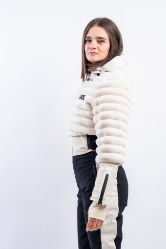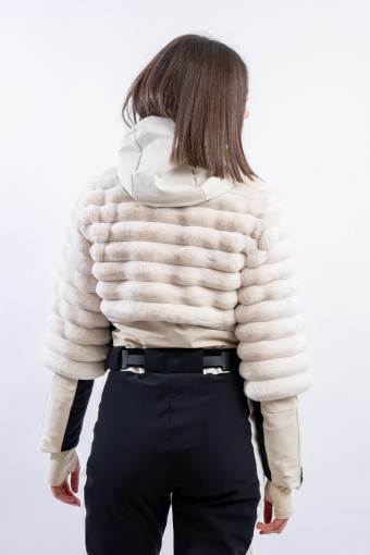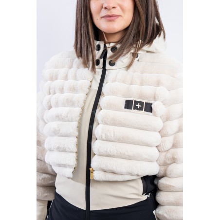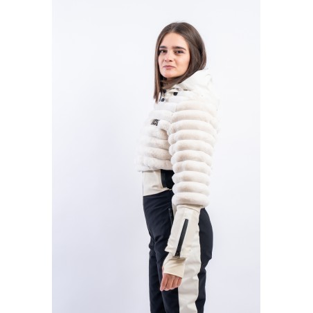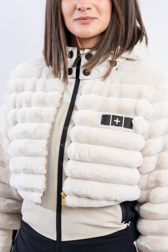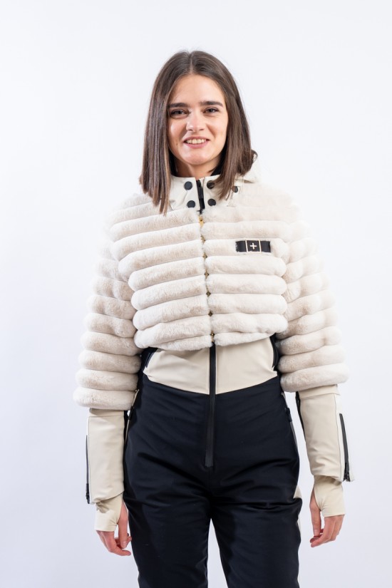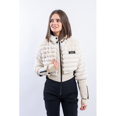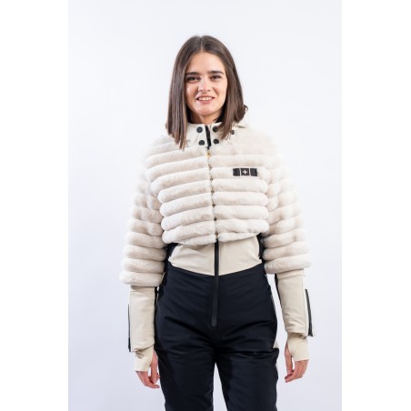 Bolero made of soft Econylon® fabric covered in soft 3D-effect quilted faux fur. Finished with a precious metal-look zip closure and enriched by the metal logo applied to the chest. CINQUE DUE UNO is the perfect complement to embellish the look on the slopes or the everyday outfit with a touch of sophisticated elegance.