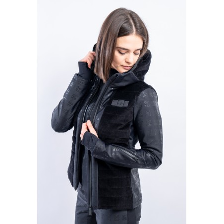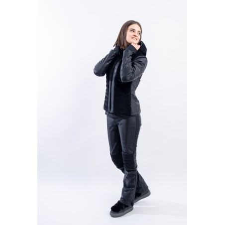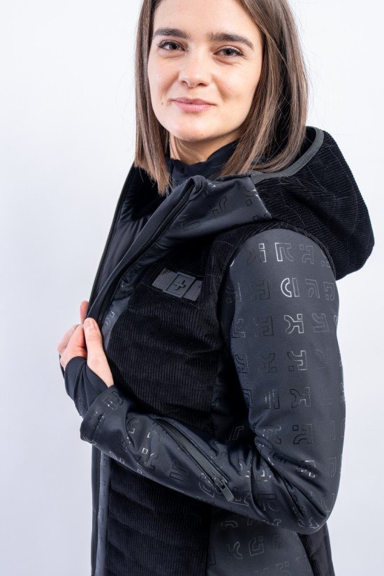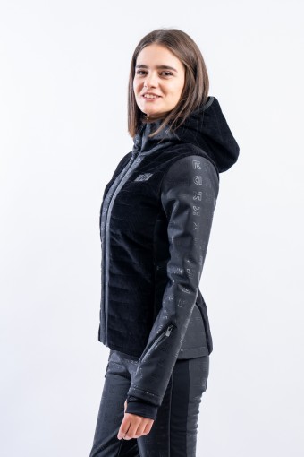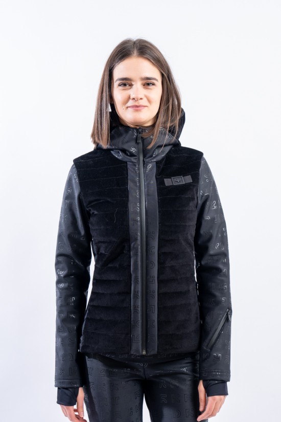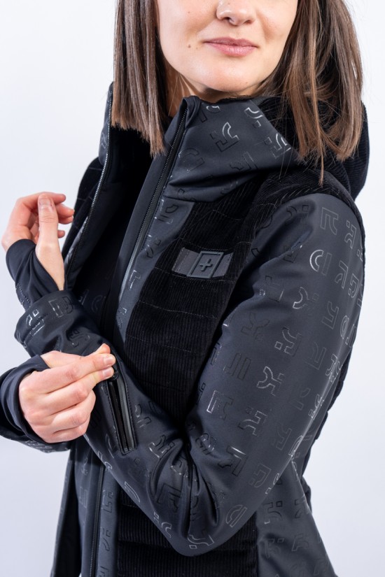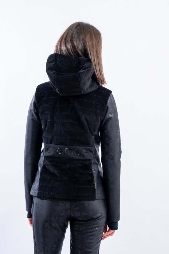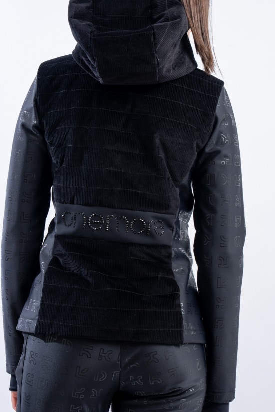 Born in South Tyrol ONE MORE is the result of the fusion between sport and nature, it stands out as a contemporary, technological and ecological brand. The 451 softshell jacket is the sporty cut jacket characterized by sophisticated elegance enhanced by the fitted cut. The 3D-effect ribbed velvet on the bust alternates with the Econylon® fabric on the sides and sleeves, enriched by the iconic print ONE MORE shiny effect. Suitable for any outdoor activity when temperatures are higher, or as an additional complement on colder days, it is equipped with a hood and ski pass pocket. Embellished with the OneMore lettering made of Swarosvki crystals, it is a functional and practical garment that does not compromise on style and elegance.