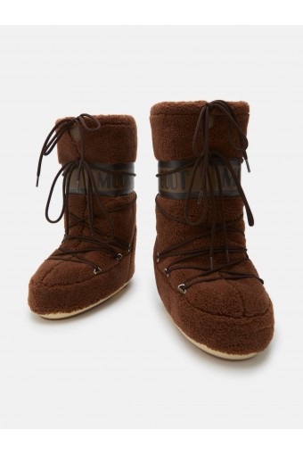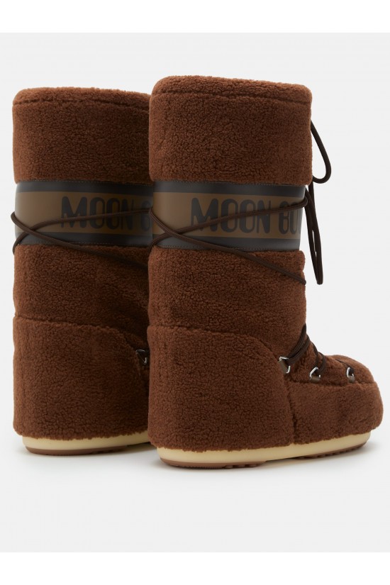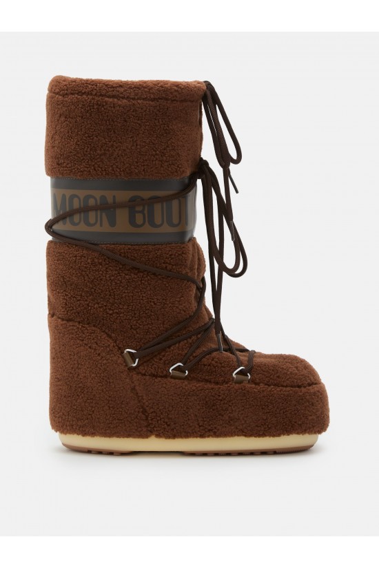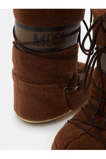 The iconic MOON BOOT model inspired by the moon landing, ambidextrous and genderless, has been revisited in the material. Covered in soft polyester worked with a teddy bear effect, it is comfortable and original. The iconic padding keeps the foot warm and dry. There is no shortage of distinctive details of the brand, the woven tubular laces on the front and a branded collar.