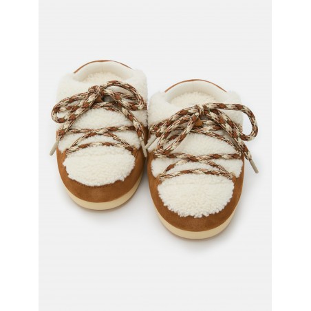Icon Mule reworks the shapes of the iconic après-ski MOON BOOT with a slip-on model with an exposed heel. As warm as après-ski and as comfortable as a slipper. Made of fine suede and lined in soft shearling enriched with the distinctive two-tone tubular laces. A lightweight midsole and a thick, flexible sole ensure comfort and lightness. Grip on the ground is guaranteed by a non-slip tread. Unconventional model suitable for everyday metropolitan life.