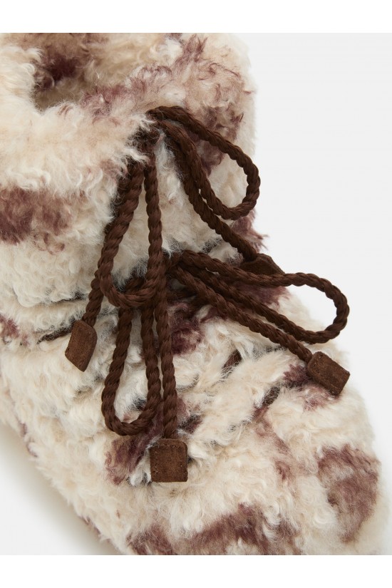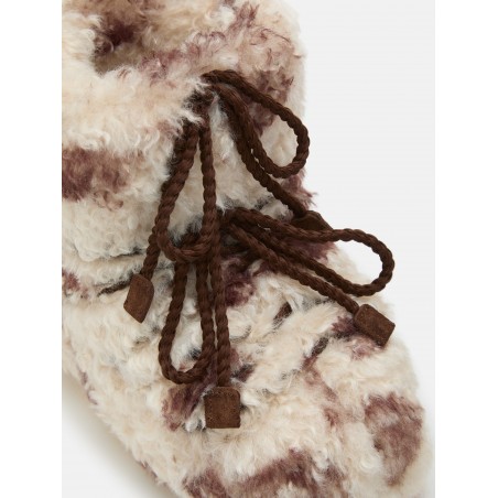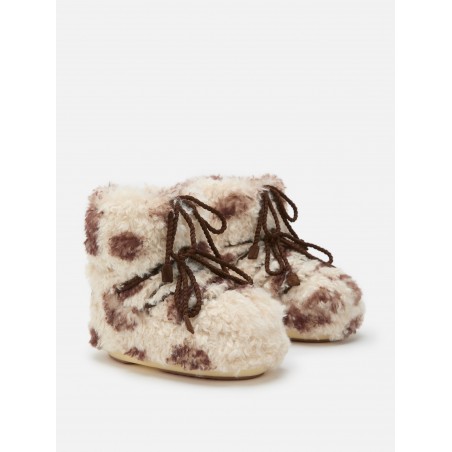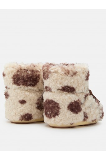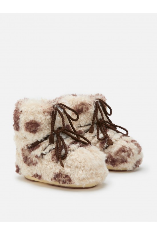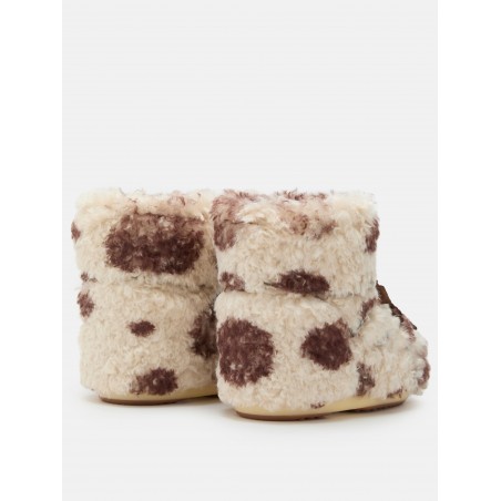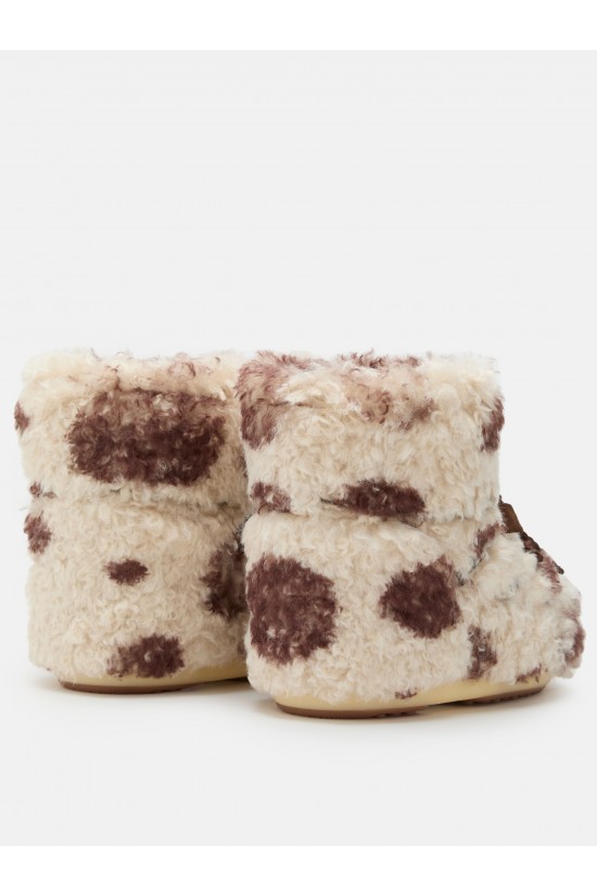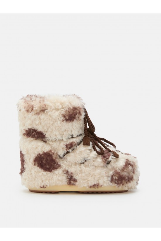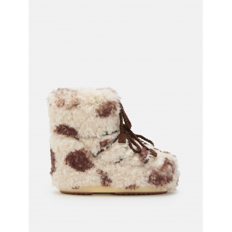 Iconic MOON BOOT model inspired in its shapes by the '69 moon landing and inspired by the country world in the fabric. Upholstered in soft teddy-effect polyester in cow pattern. The iconic insulating padding keeps the foot warm and dry. Genderless, ambidextrous design. The heel is reinforced, the lightweight midsole and the non-slip tread provide comfort and safety. Finished with braided laces to the front. In this low-top version it is comfortable and versatile, perfect even in the city.