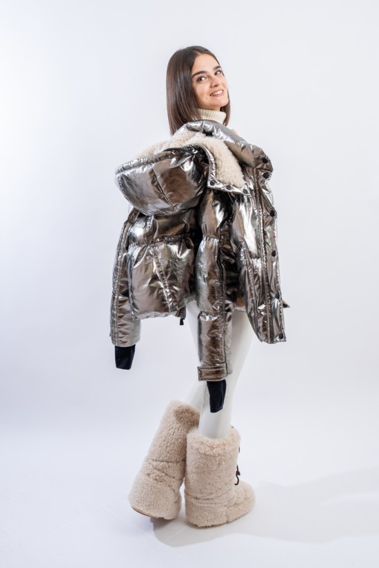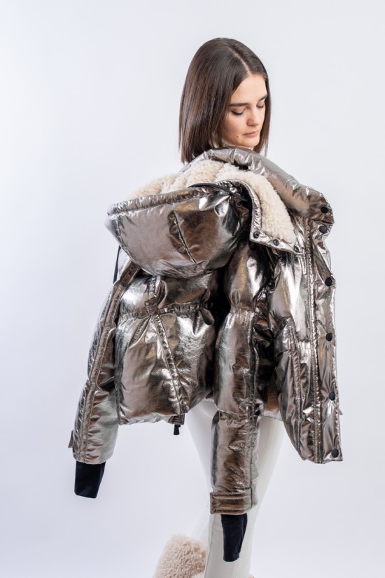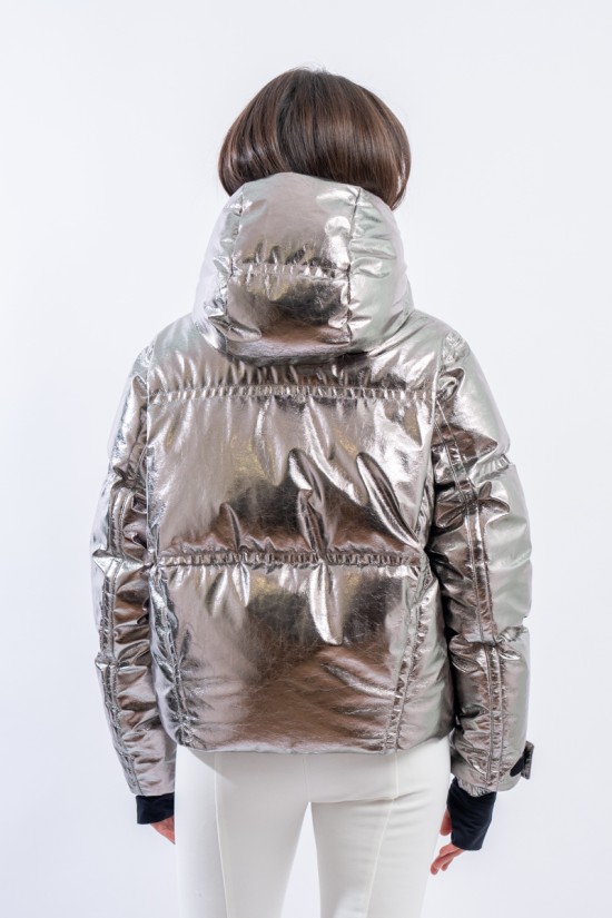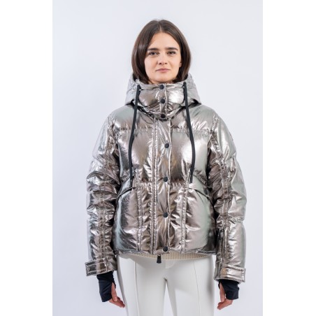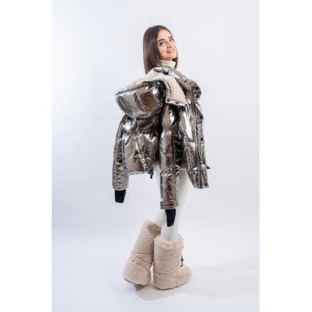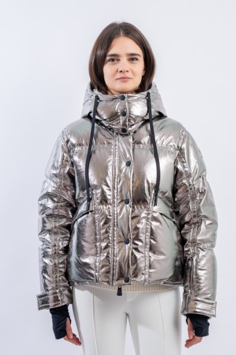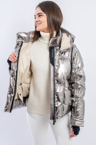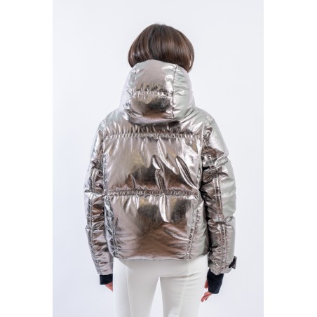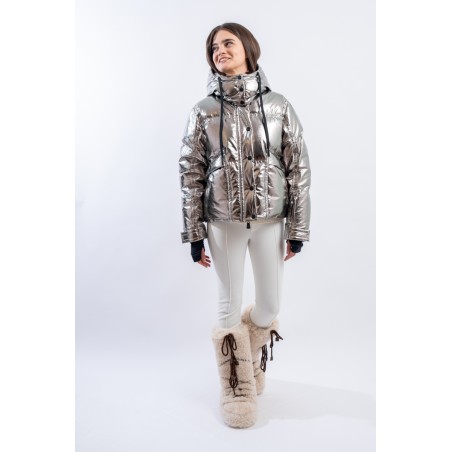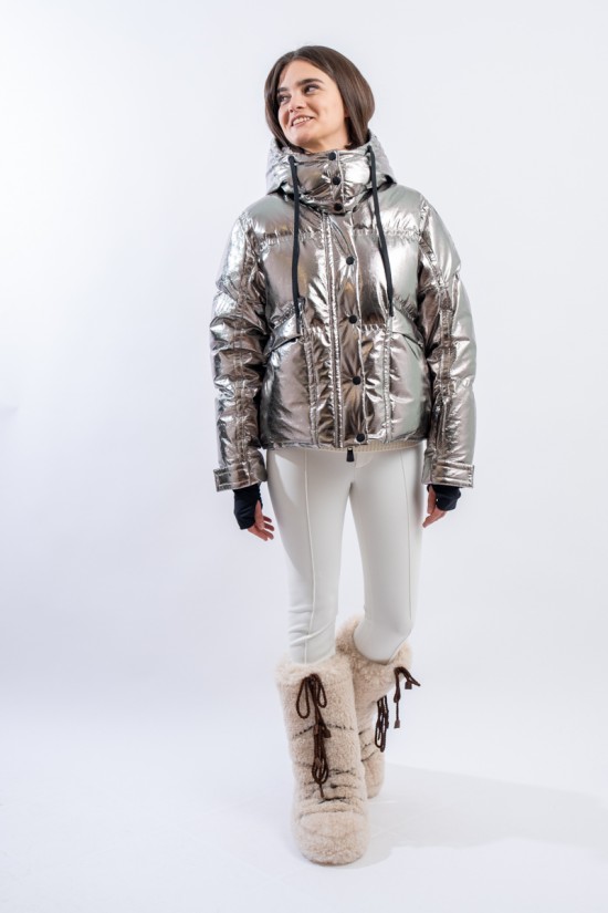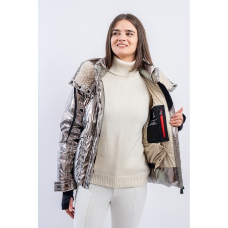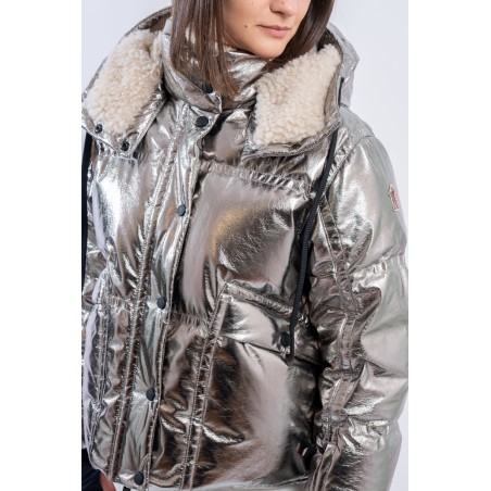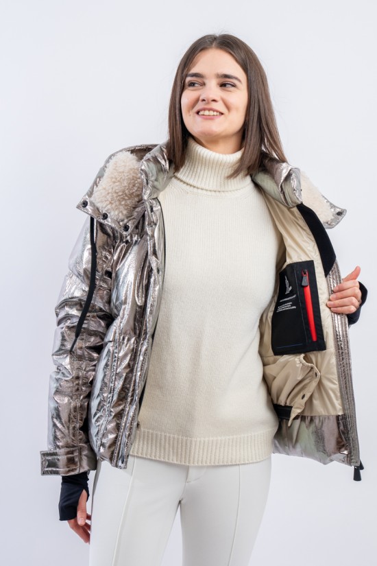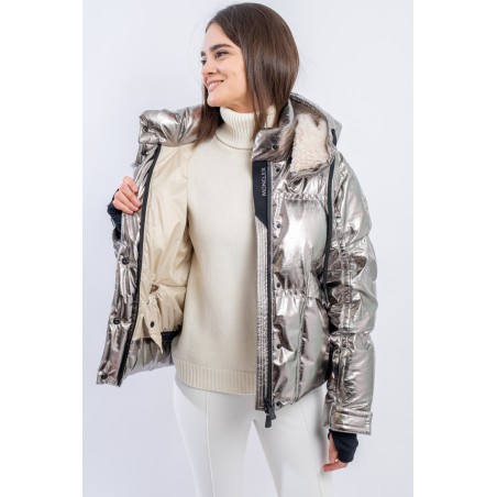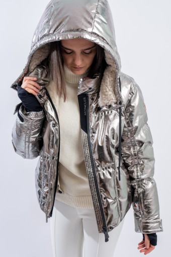 Innovative design characterized by large boudines and characterized by the metallic outer fabric with a craquelè effect. Celaque is the jacket that combines high-performance features with an original and sophisticated look. The large, warm and enveloping hood finishes and embellishes the garment thanks to the soft teddy-effect fleece lining. Padded with high-quality 90/10 down, it is warm and light. Equipped with every anti-snow option and ski pass pocket, it is perfect on the slopes in all conditions.