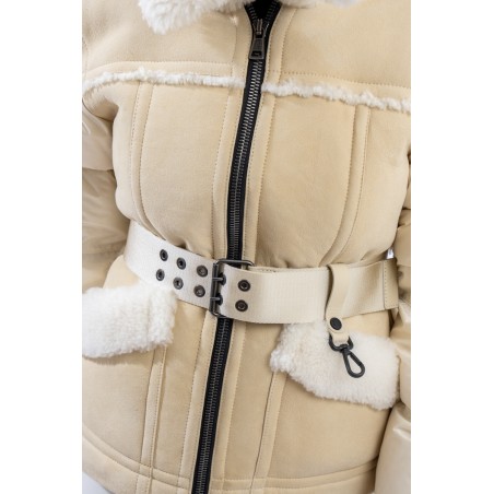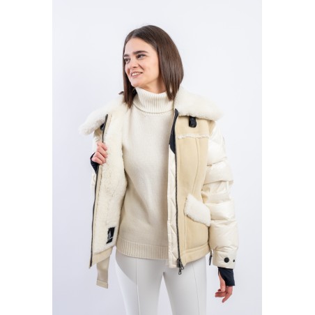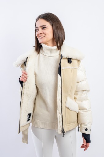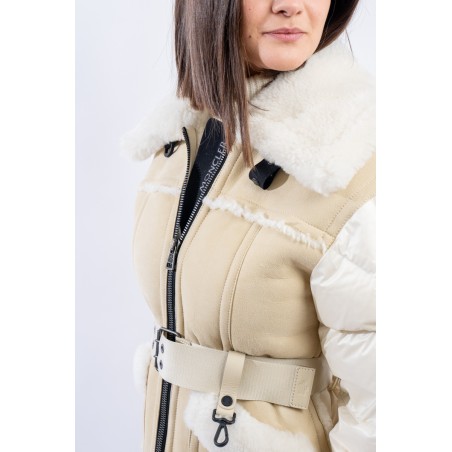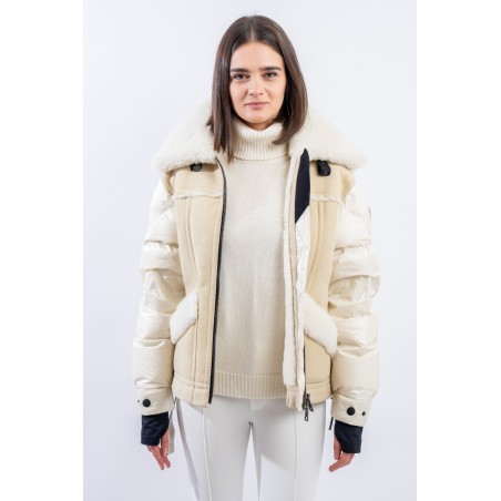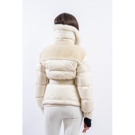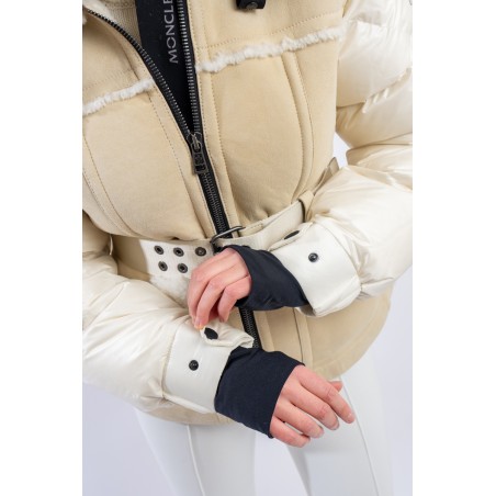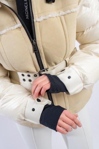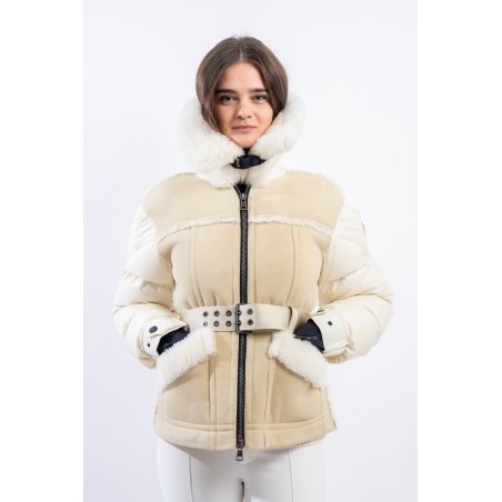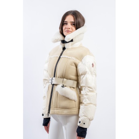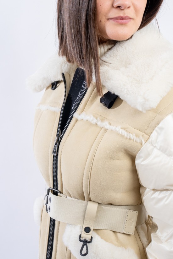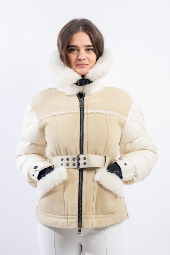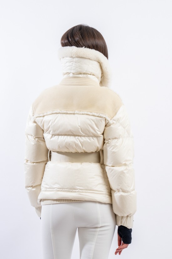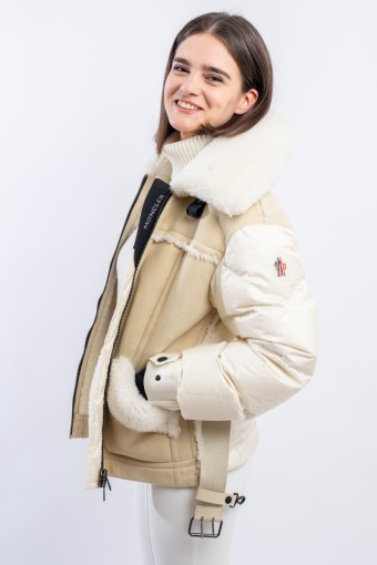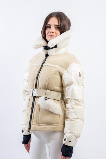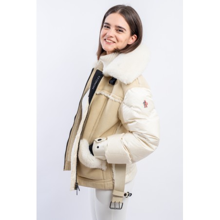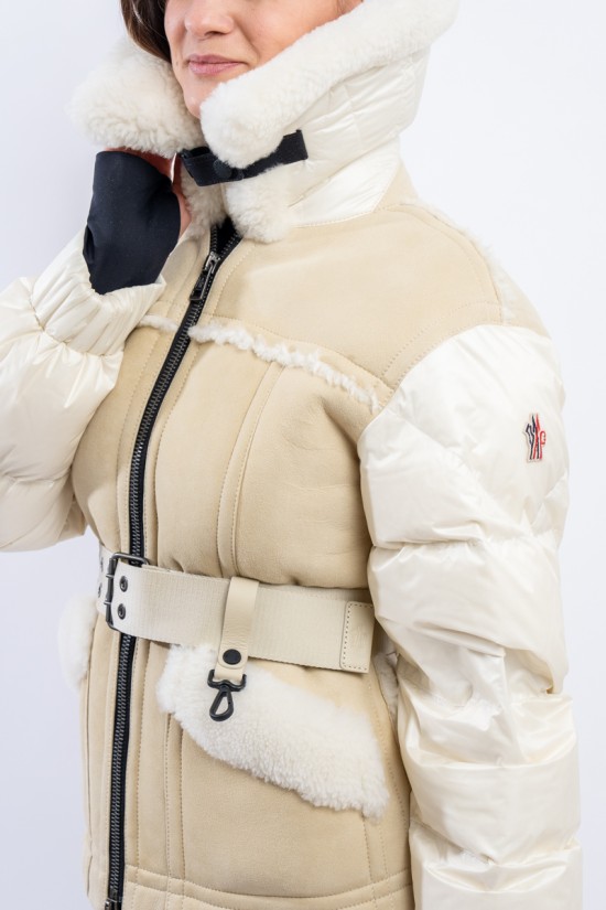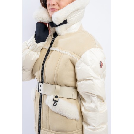 Auvergne is synonymous with luxury and contemporary form, it is ideal for enjoying a precious and sophisticated winter break. Padded with fine 90/10 down collected in a technical nylon with a luminous look, it is warm and light. Soft shearling on the front embellishes the garment. The wide collar is warm and enveloping. The belt at the waist enhances it, enhancing the female figure. Equipped with snow protection options, it fully reflects the philosophy of MONCLER Grenoble, functionality and style. For a classy après-ski or a relaxing walk, Auvergne is the right piece of clothing.