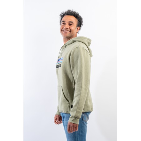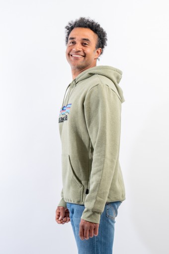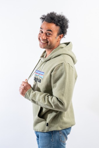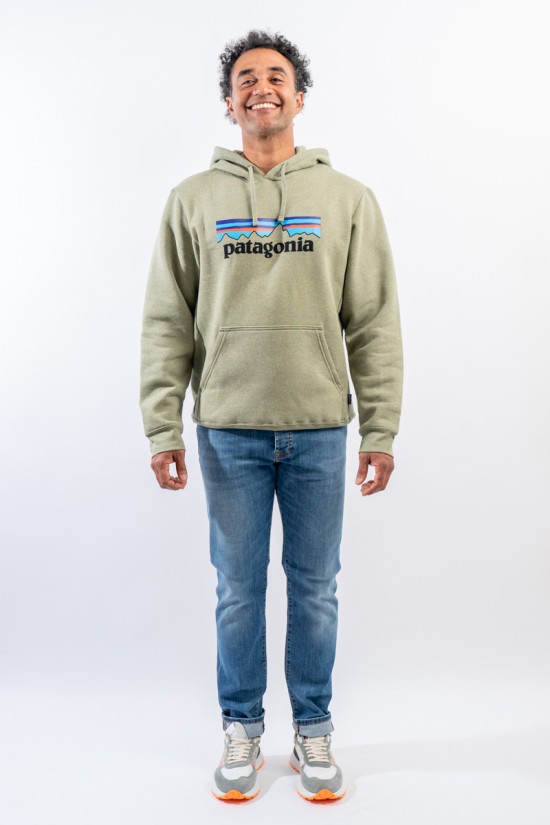 Felpa con cappuccio realizzata con materiali riciclati ottenuti impiegando 30 bottiglie di plastica e circa 408 grammi di scarti tessili di cotone. Caratterizzata dalla maxi stampa e dalla tasca scaldamani applicata sul davanti. Il sistema ecofriendly adottato da Patagonia consente di risparmiare il 95% d'acqua rispetto alla produzione di un capo analogo.