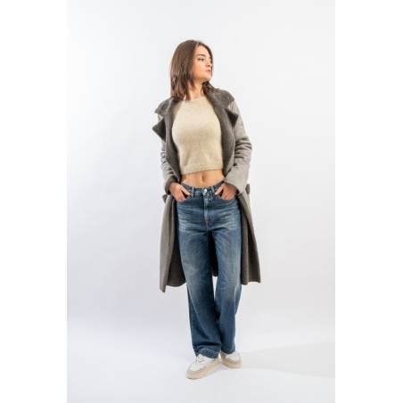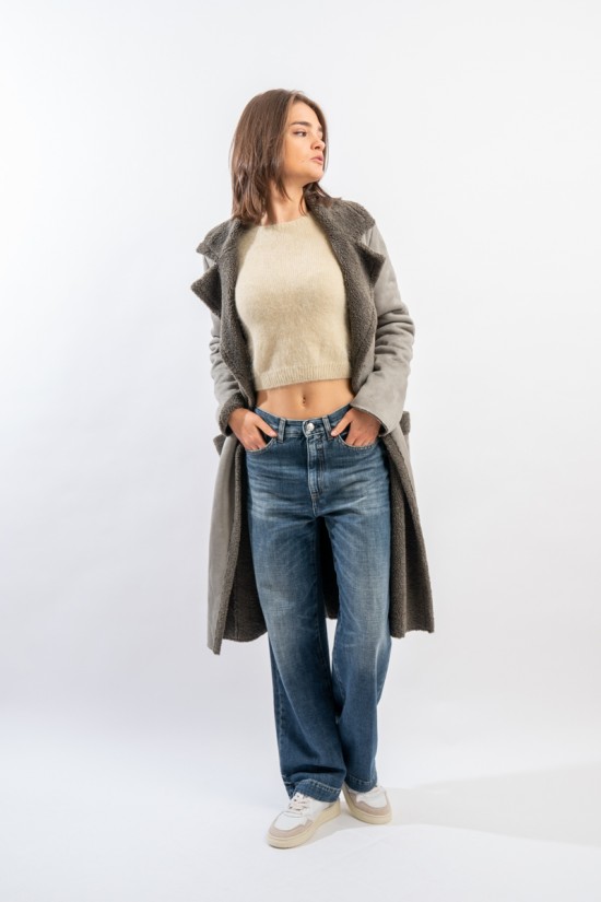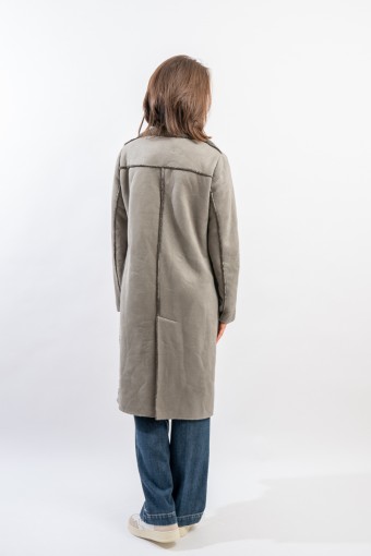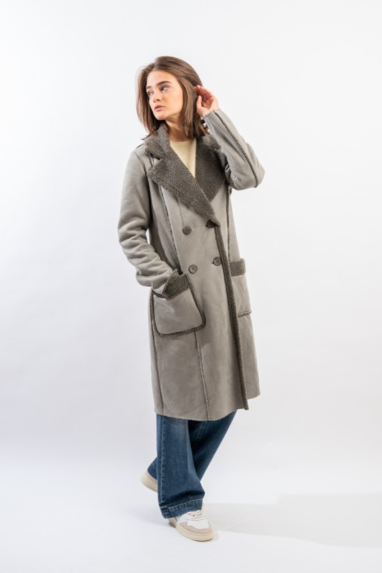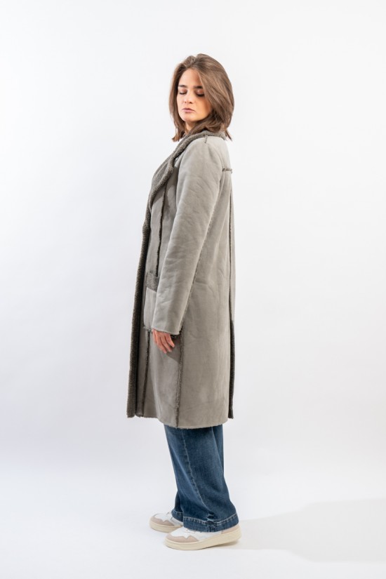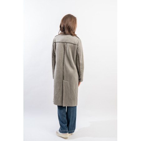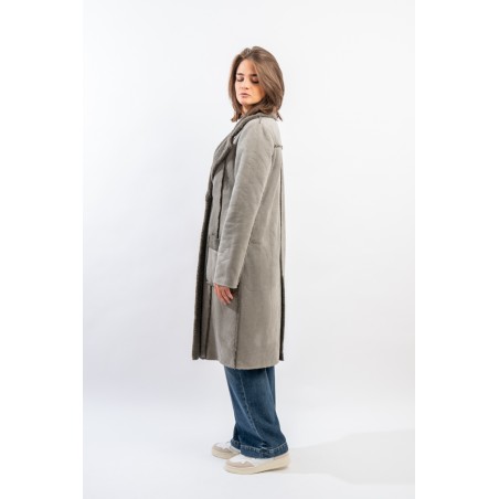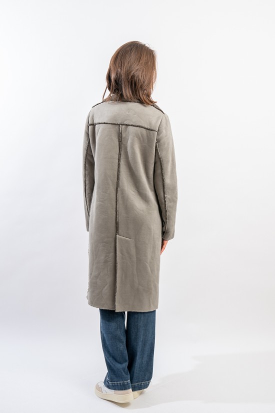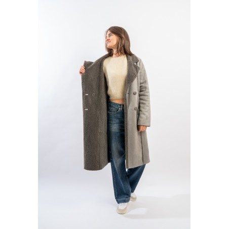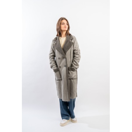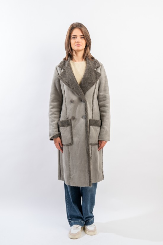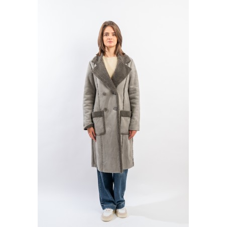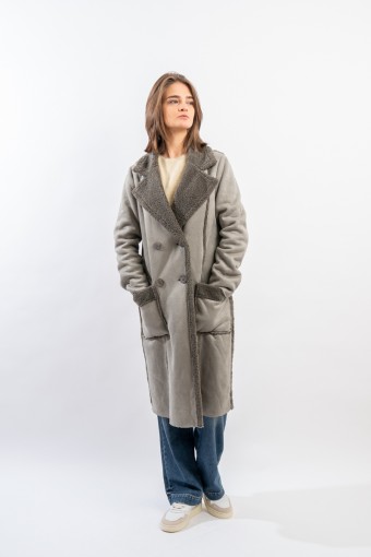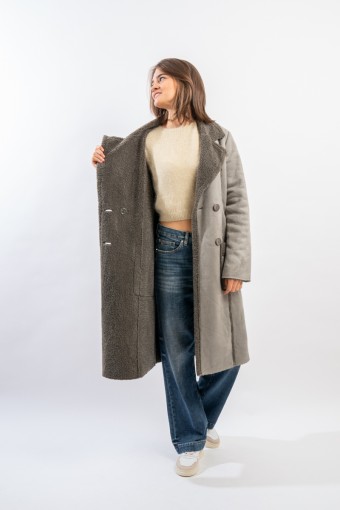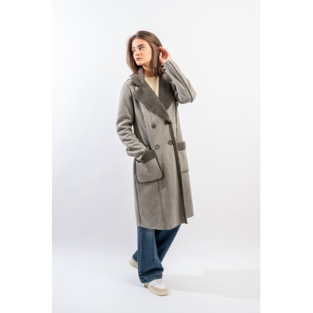 Cappotto doppiopetto realizzato in eco-montone con vestibilità regular. Tinto in capo per ottenere un risultato di effetto vissuto dalla mano morbida al tatto. Made in Italy.