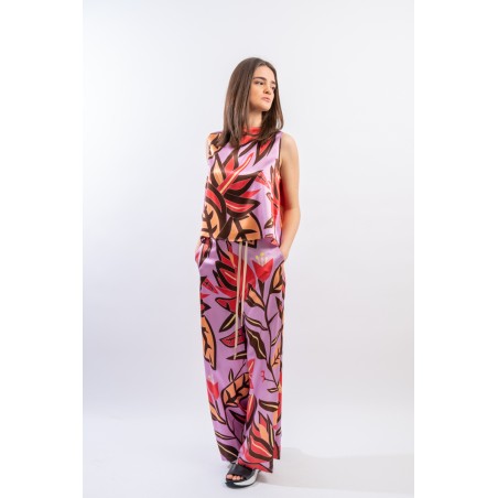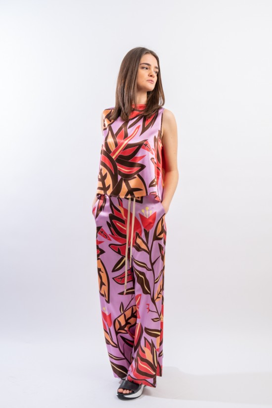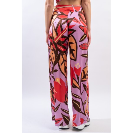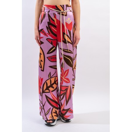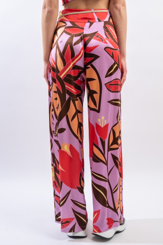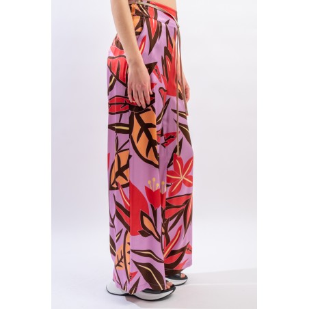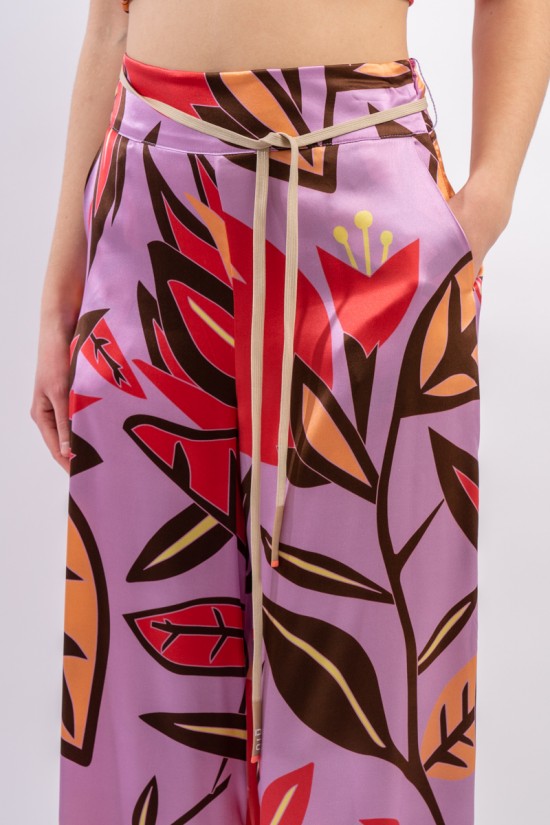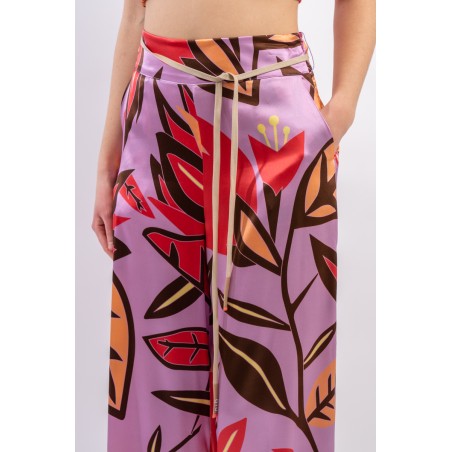 Pantalone ampio con cinturina in tessuto realizzato in seta stretch. La fantasia floreale è raffinata e particolrmente luminosa in questo materiale.