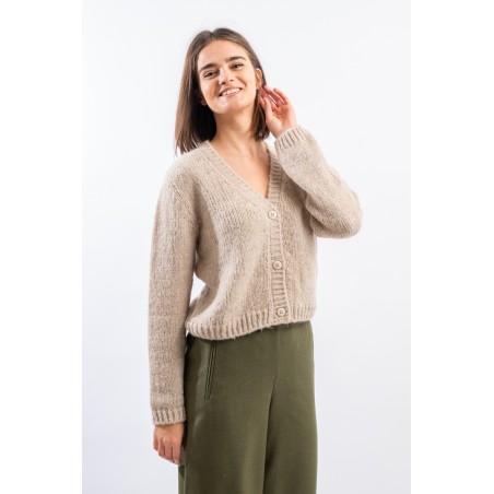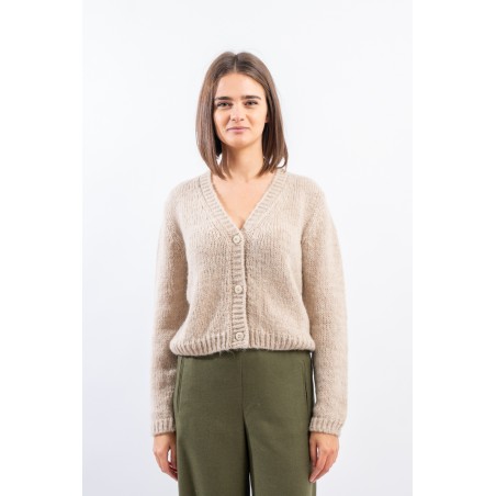 Cardigan scollo a V Niu a manica lunga. Realizzata in un filato misto lana con lavorazione a maglia larga presenta scollo, fondo e polsi a costine. Dalla linea essenziale e vestibilità regular, è versatile e funzionale.
