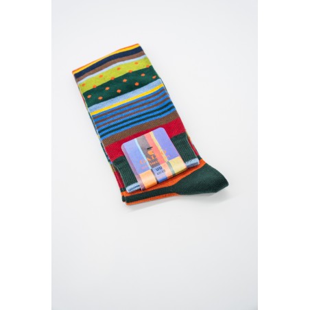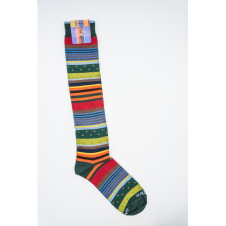 Calze lunghe realizzate in morbido cotone, originali ma riconoscibili con pois e strisce multicolor. Fascetta, tallone e punta con colori in coordinato. Sono le calze perfette da abbinare ad ogni look. Gallo è qualità Made in Italy e eccellenza dal 1927.