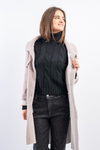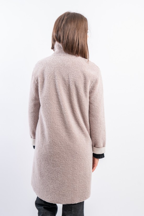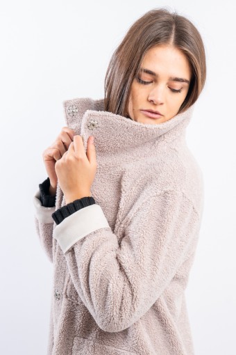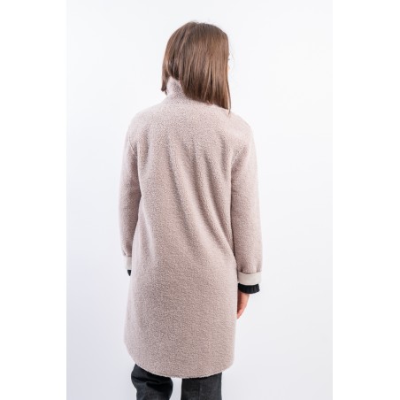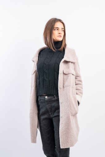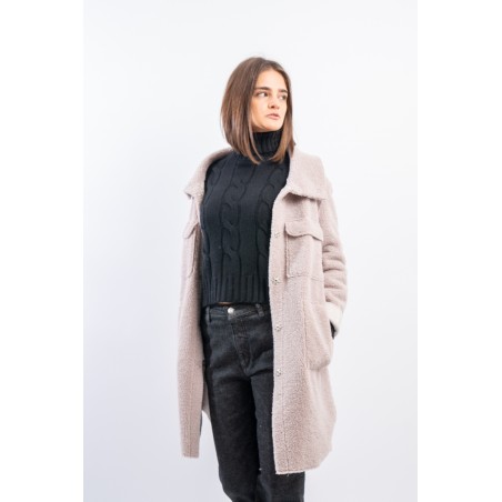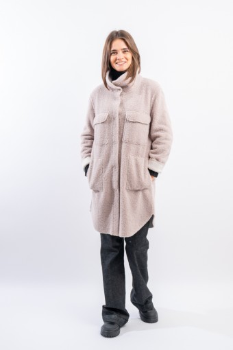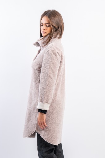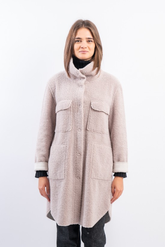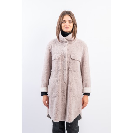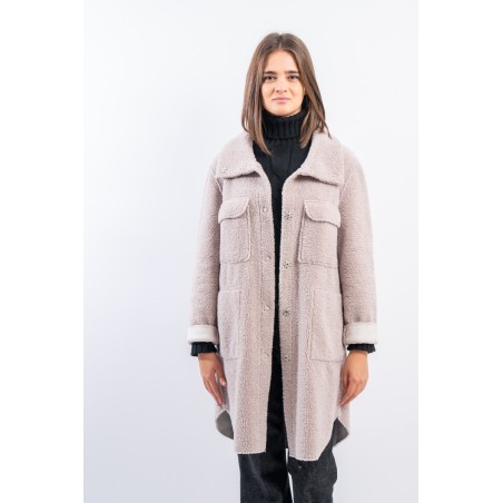 Giacca camicia di media lunghezza realizzata in morbido e caldo eco-montone. Collo a cratere con chiusura a bottoni automatici, impreziosita dalle cuciture a vista e dalle tasche applicate con patta. Vestibilità regular fit. Made in Italy.