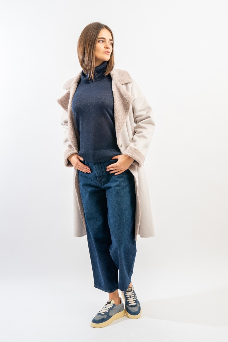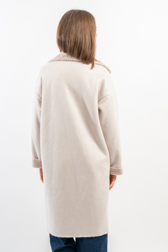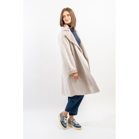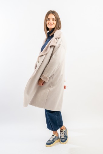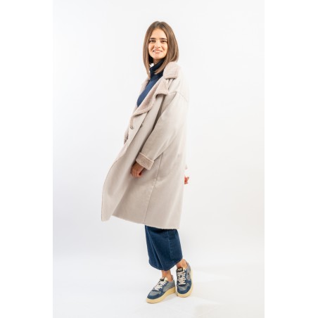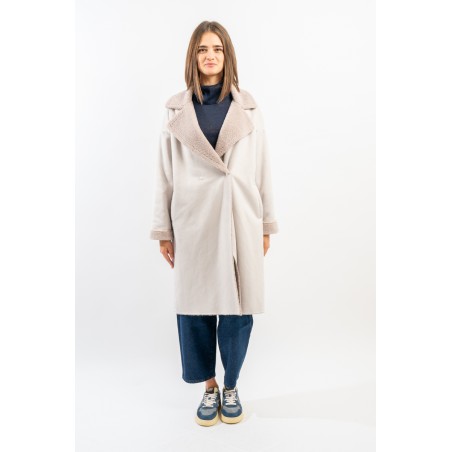 Cappotto realizzato in eco-montone con vestibilità oversize. Interno, revers e polsi realizzati in pelliccia ecologica. Made in Italy.