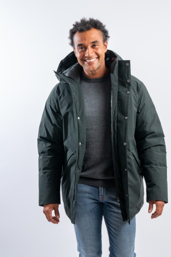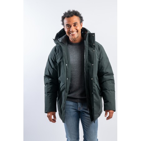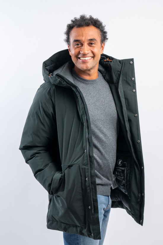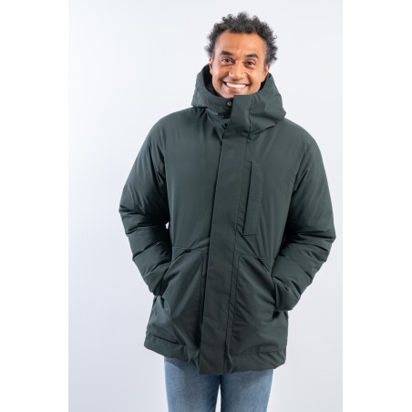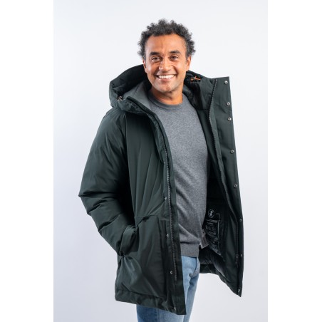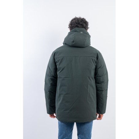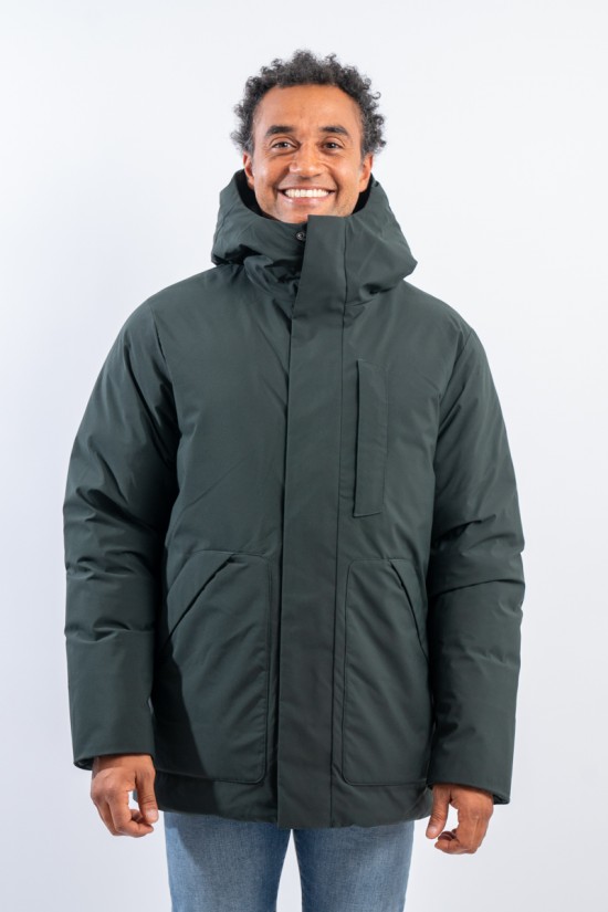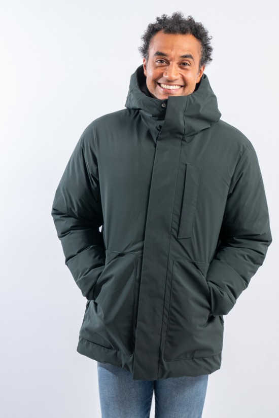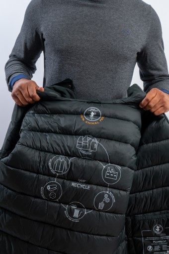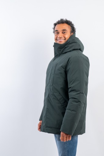 Giubbotto di media lunghezza, con cappuccio fisso. Realizzato in materiale liscio effetto matt, antipioggia e antivento. La zip centrale nera è nascosta e chiusa da patta con bottoni a pressione, doppio cursore. L'imbottitura in plumtech, piuma sintetica riciclata, è un'ottima alternativa al vero piumino e garantisce un perfetto isolamento termico anche con temperature rigide. Le tasche laterali con taglio diagonale, sono chiuse da zip nascoste su entrambi i lati, terza tasca di servizio, anch'essa chiusa con zip nascosta. Polsi chiusi da profilo nero in lycra nero elasticizzato.