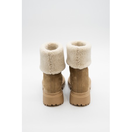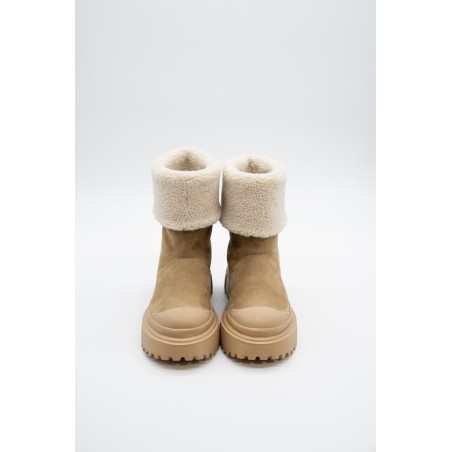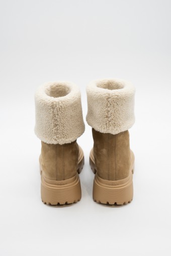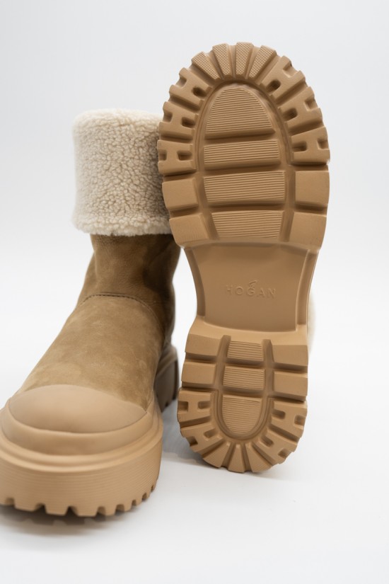 Caldo ed essenziale si presenta lo stivaletto wintery di Hogan realizzato in morbido nabuk con gambale e fodera interna rifinita in caldo pile bouclé. La suola carrarmato presenta dettagli millerighe, mentre il battistrada viene caratterizzato da tasselli esterni a forma di H. Per proteggere e allo stesso tempo dare un tocco di stile, la punta viene impreziosito da un dettaglio in gomma su tono. Ideale per affrontare anche i climi più freddi.