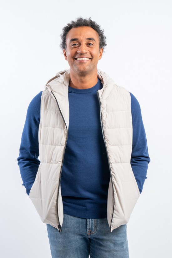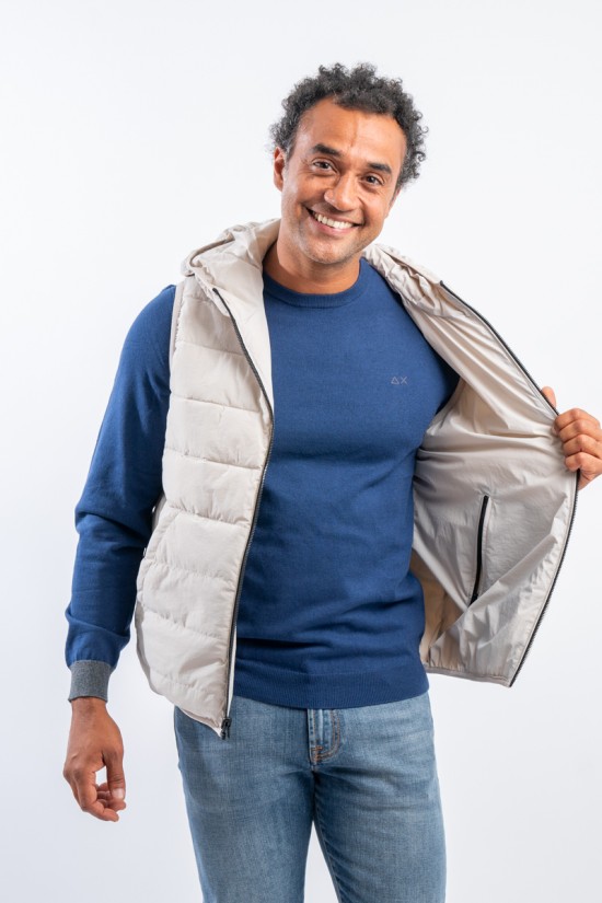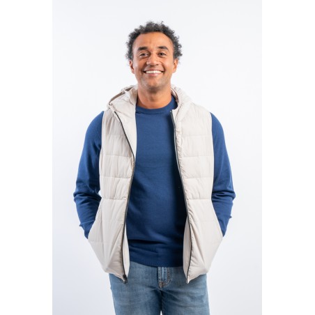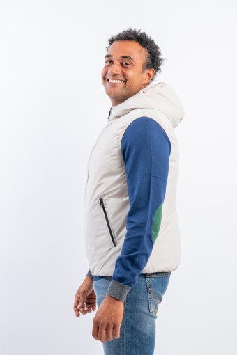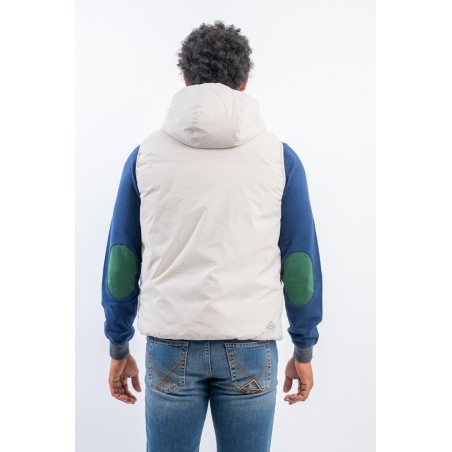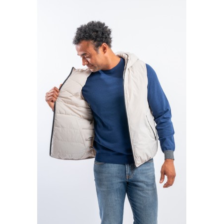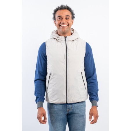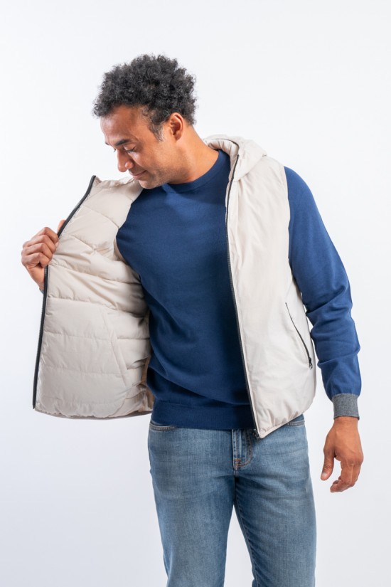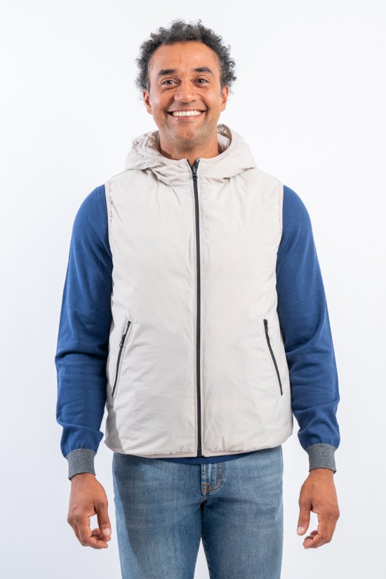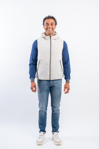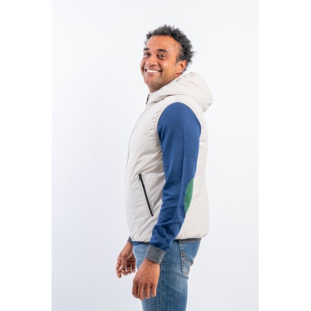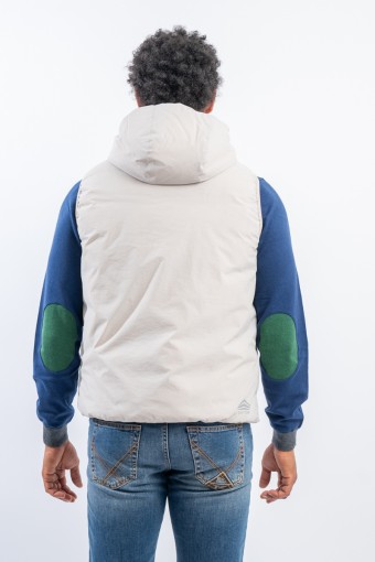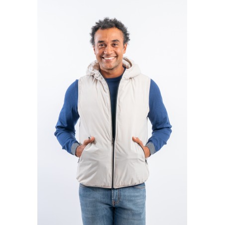 Gilet imbottito double face con cappuccio per sentirsi protetti e liberi nei movimenti in ogni condizione.