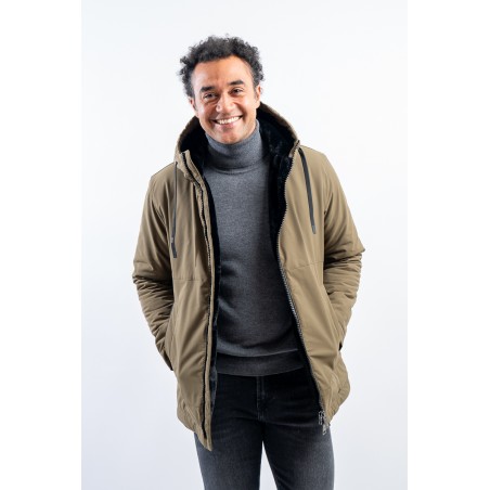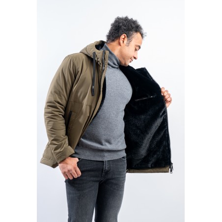 Giaccone Herno foderato in morbida ecopelliccia con chiusura zip a doppio cursore. Dotato di cappuccio fisso foderato e coulisse regolabile, doppie tasche laterali con chiusura a zip, due comode tasche intene chiuse con zip. Impreziosito dalle linee semplici che conferiscono un'eleganza contemporanea, eccellente in montagna, irrinunciabile nella quotidianità metropolitana.