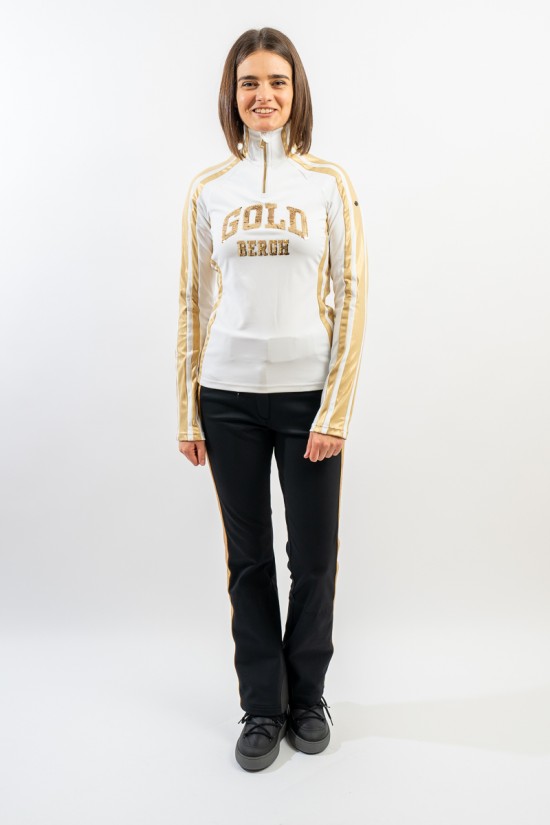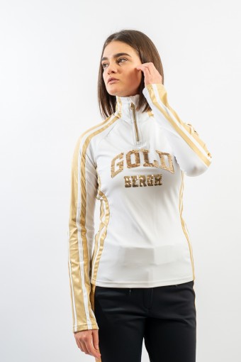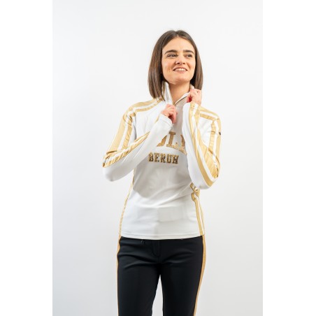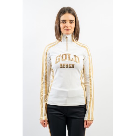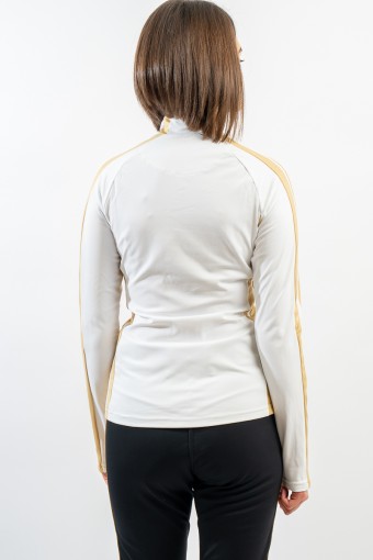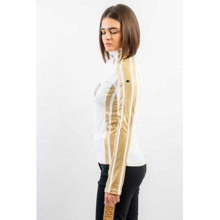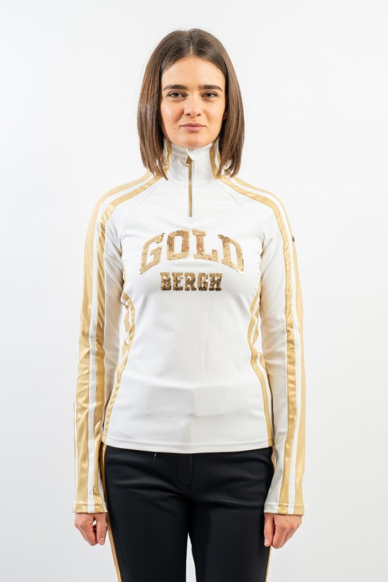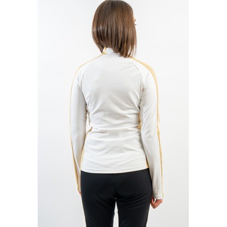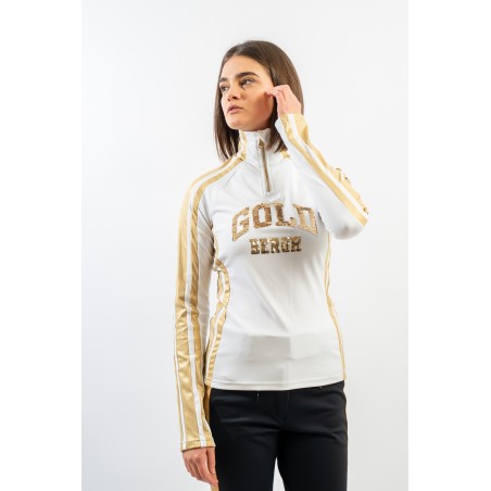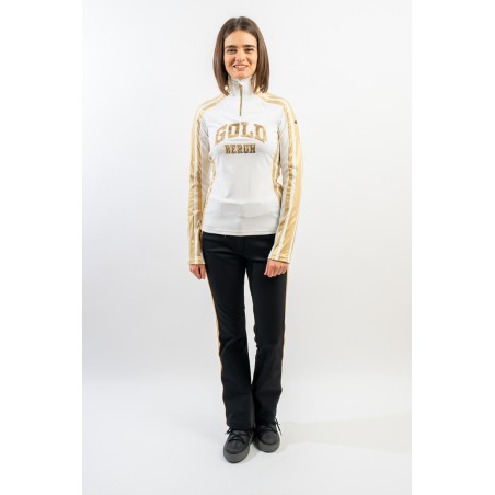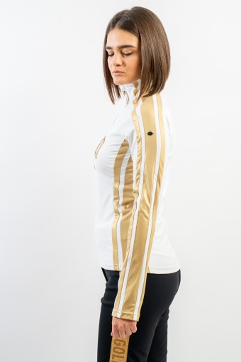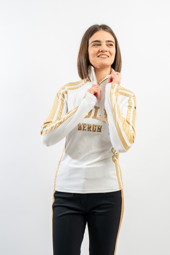 Sottotuta mezza zip in tessuto elasticizzato e traspirante. Impreziosito dalla scritta sul davanti in paillettes e dalle fasce in contrasto di colore che corrono su fianchi e maniche. Costruito con tecnologia Silvadur ad azione antibatterica. Vestibilità slim. Morbido e leggero adatto a tutti gli sport all'aria aperta.