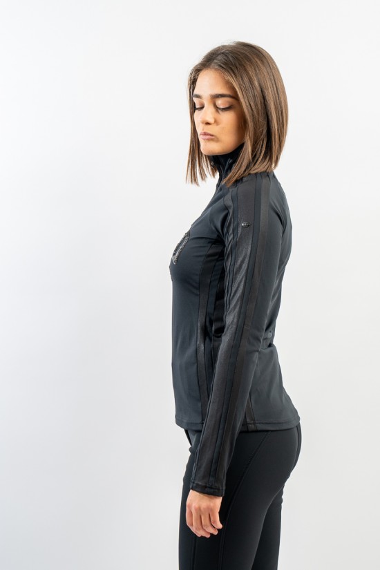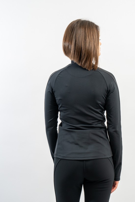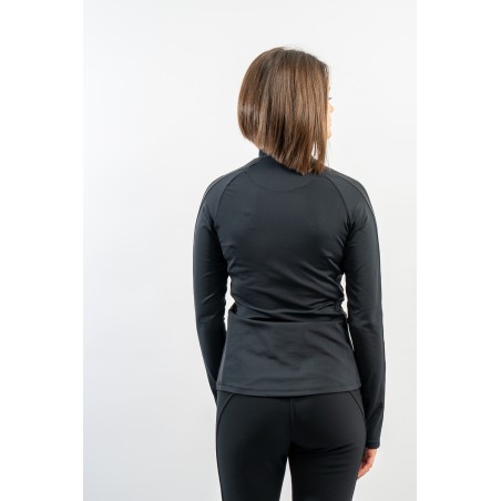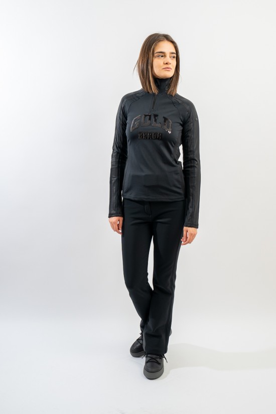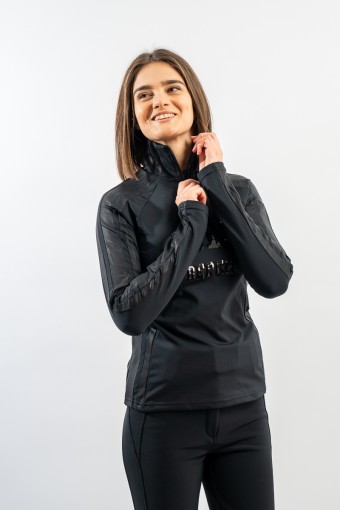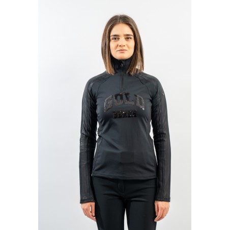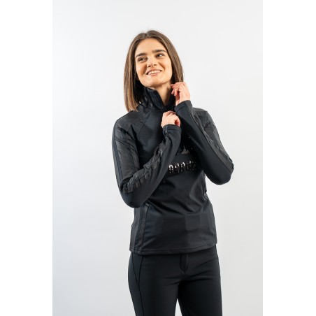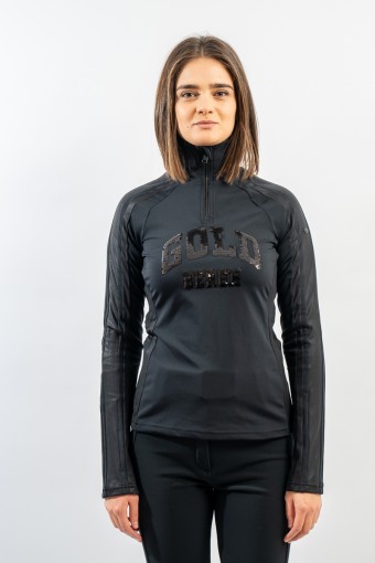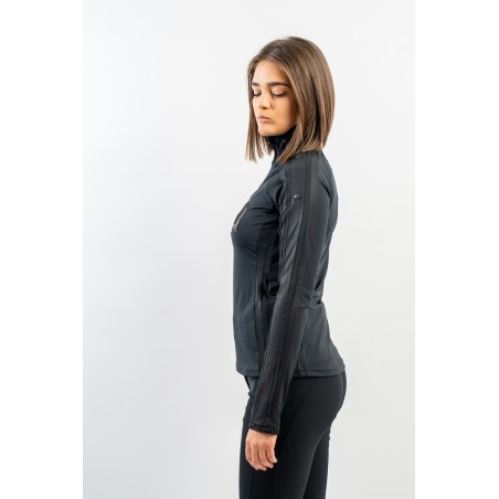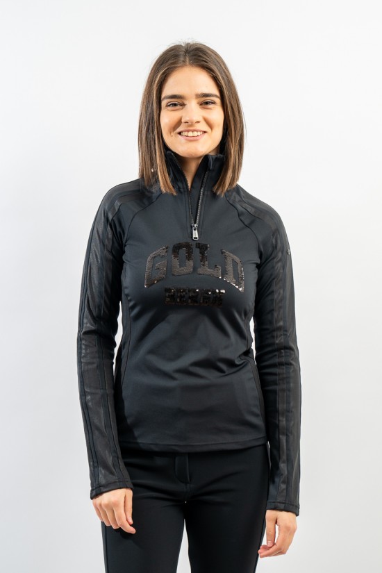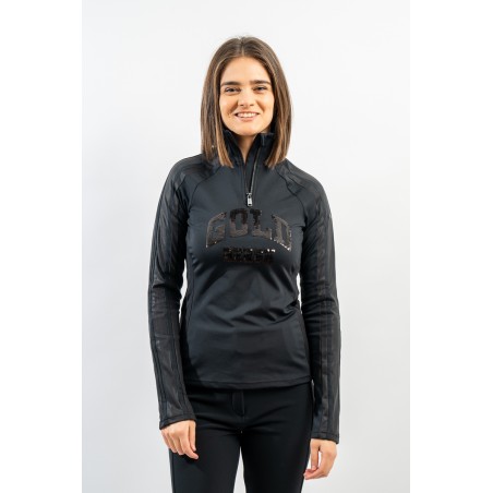 Sottotuta mezza zip in tessuto elasticizzato e traspirante. Impreziosito dalla scritta sul davanti in paillettes e dalle fasce in contrasto di colore che corrono su fianchi e maniche. Costruito con tecnologia Silvadur ad azione antibatterica. Vestibilità slim. Morbido e leggero adatto a tutti gli sport all'aria aperta.