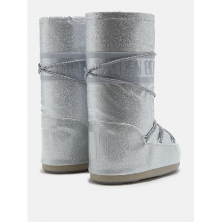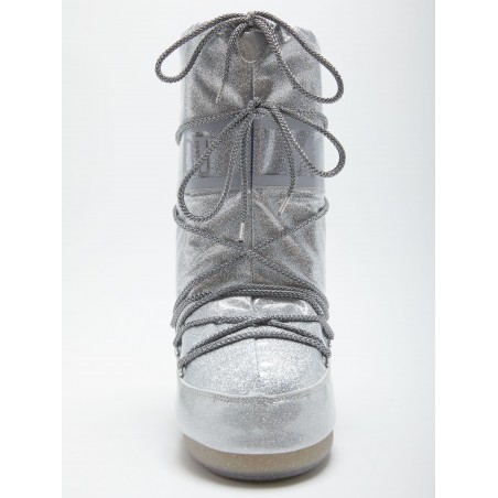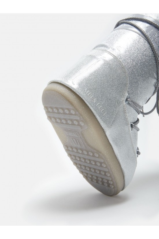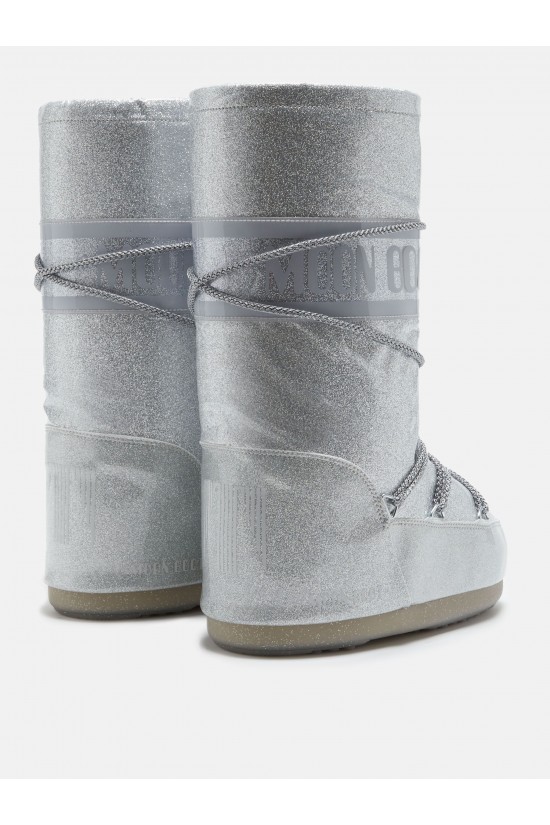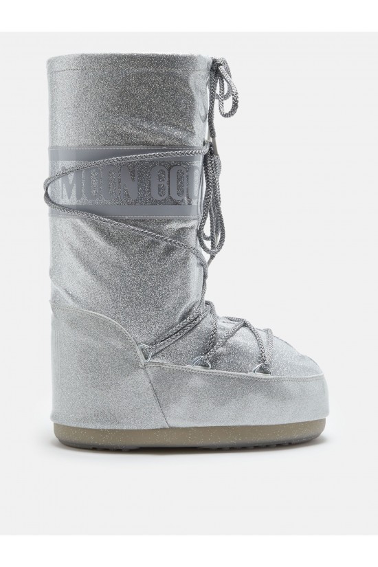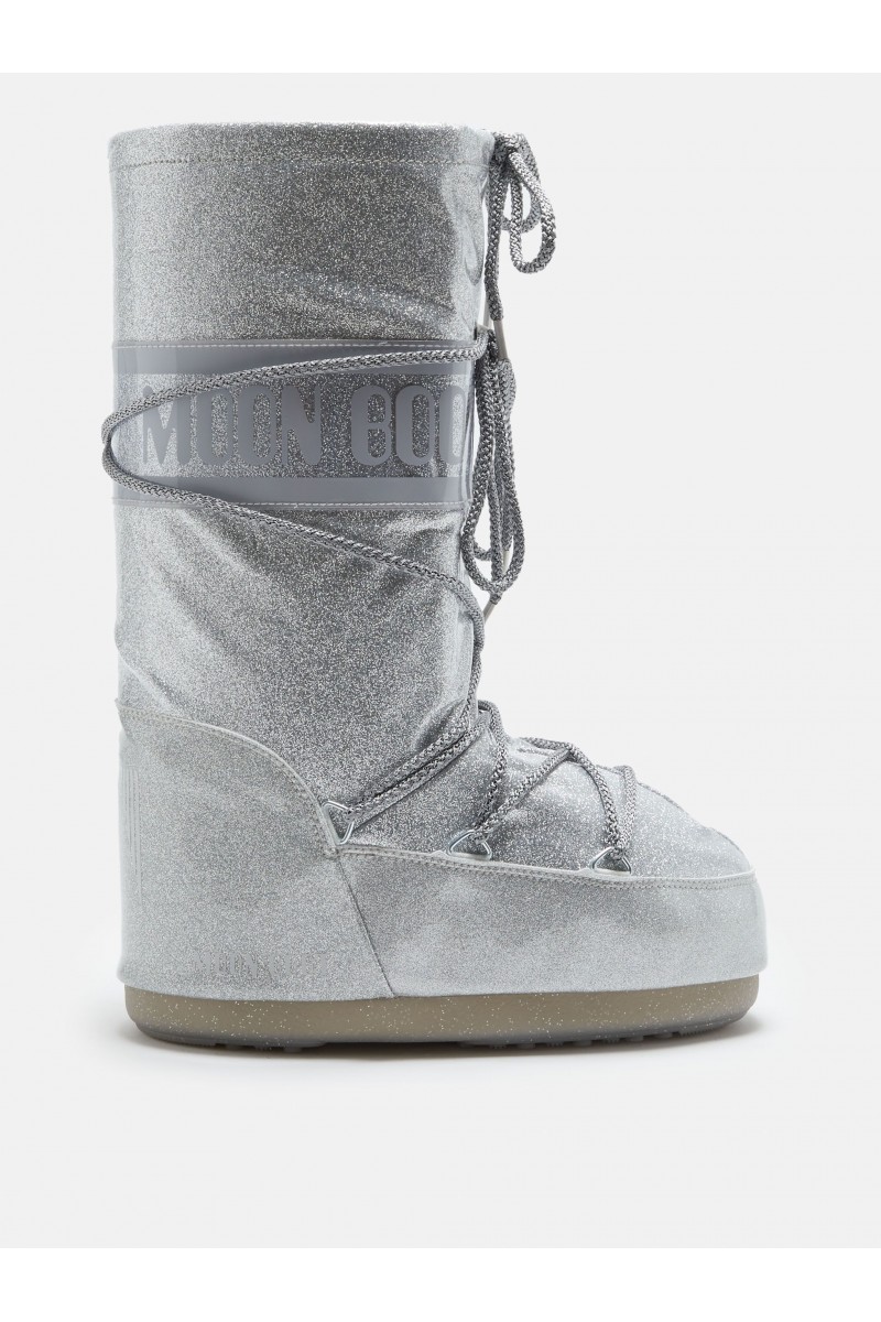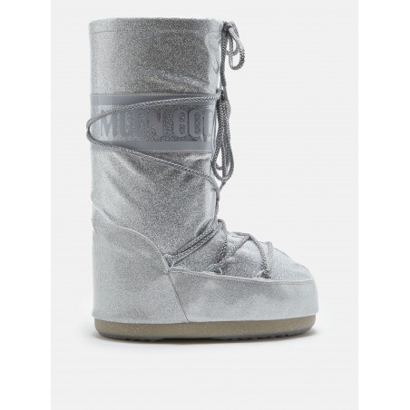 Icon è l'iconico modello di Moon Boot ispirato all'atterraggio sulla luna del 1969. Design genderless ed ambidestro arricchito da un rivestimento glitter. E' dotato di un'imbottitura isolante che mantiene il piede caldo e asciutto. Lacci intrecciati nella parte anteriore. La suola è antiscivolo per garantire la massima presa su ogni tipo di terreno.