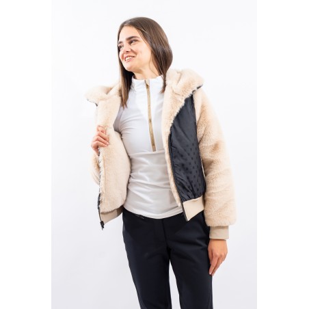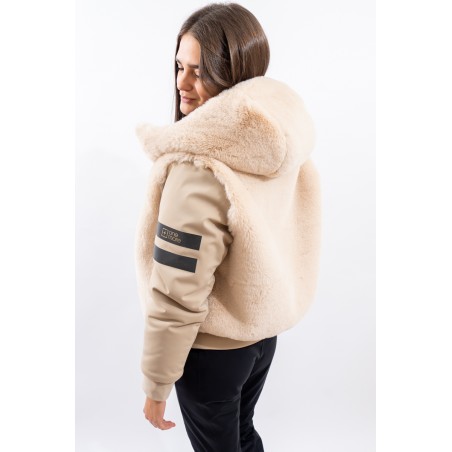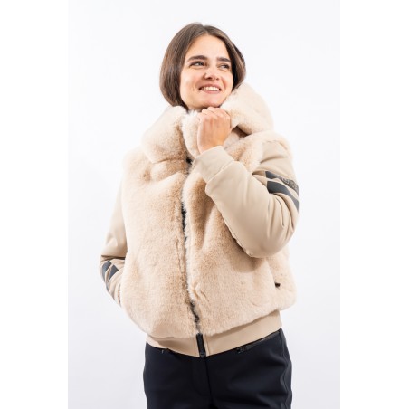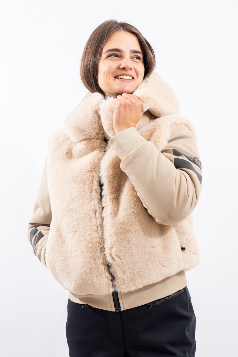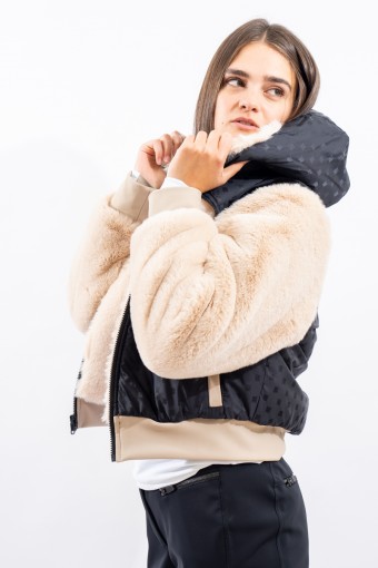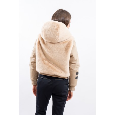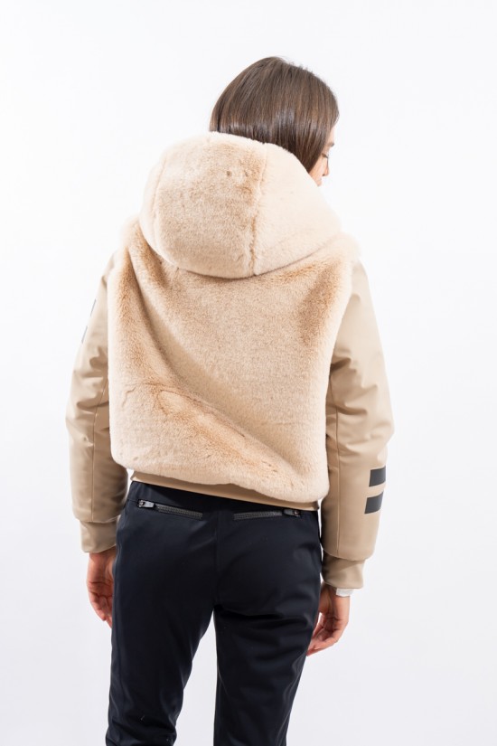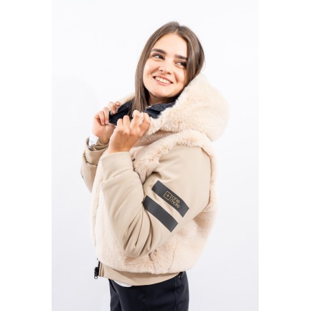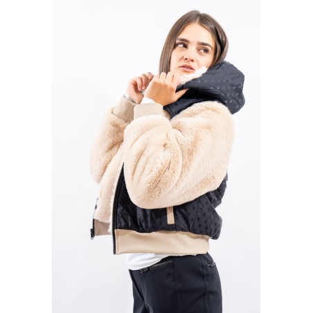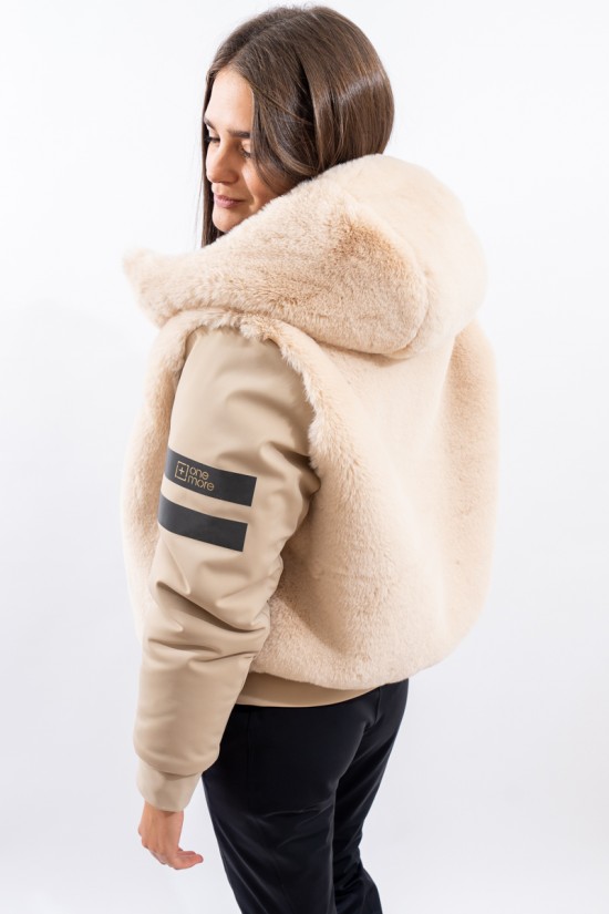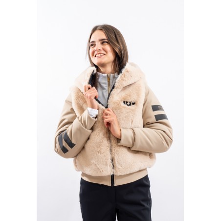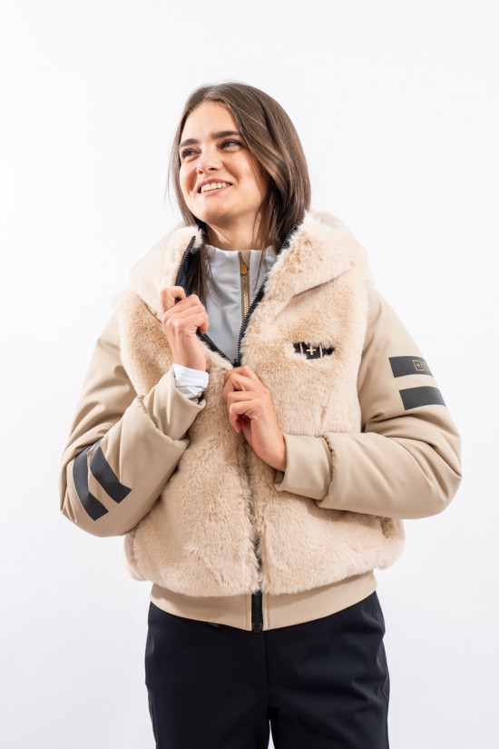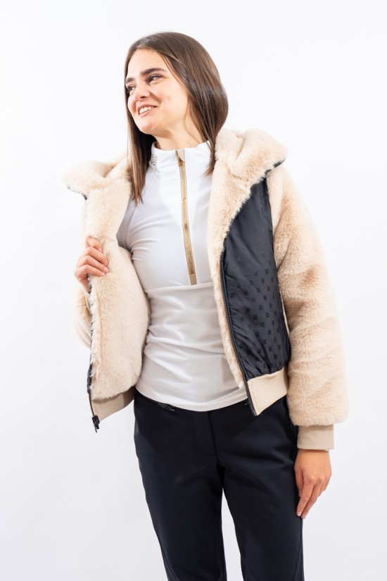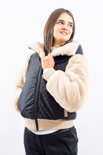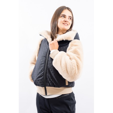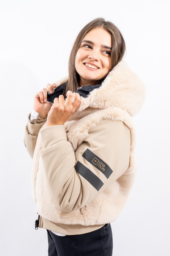 Nata in Alto Adige One More è il risultato della fusione tra sport e natura, si contraddistingue come brand contemporaneo, tecnologico ed ecologico. Il bomber Quattro Sei Uno double face si contraddistingue per la sua versatilità di utilizzo. Reversibile, può essere utilizzata nel lato in cui è rivestita in morbido ecofur sul busto, dove il taschino porta skipass ne agevola l'utilizzo in pista. Oppure dal lato opposto, dove i materiali si invertono e lo stile si trasforma. Look sportivo e chic perfettamente adattabile a luogo e condizione.