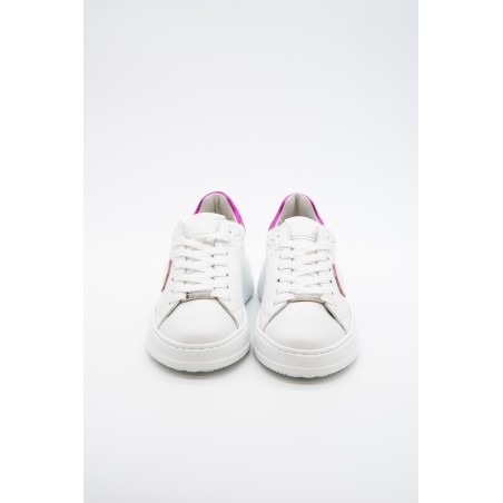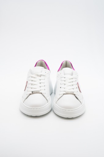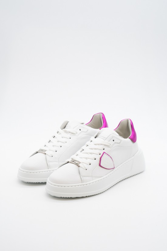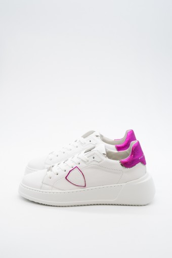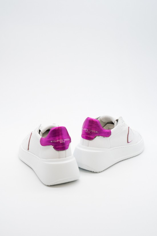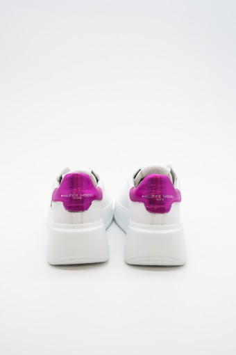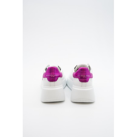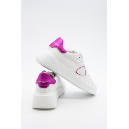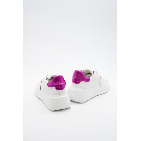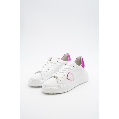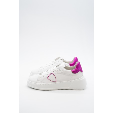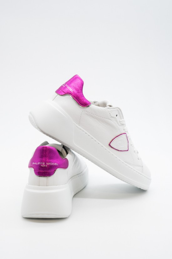 La nuova Temple Tres di Philippe Model è la sneaker high-fashion d'ispirazione anni '90. Realizzata in morbida pelle di vitello bianca con spoiler in pelle laminata pink e scudetto tono su tono con profilo metalizzato pink. Lacci in cotone e targhetta argentata logata. Innovativa la suola bold in gomma super leggera e confortevole, ideale nella quotidianità metropolitana. Look e qualità assicurati. Made in Italy.