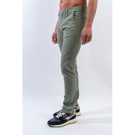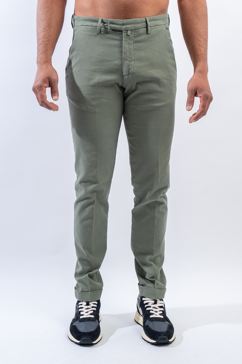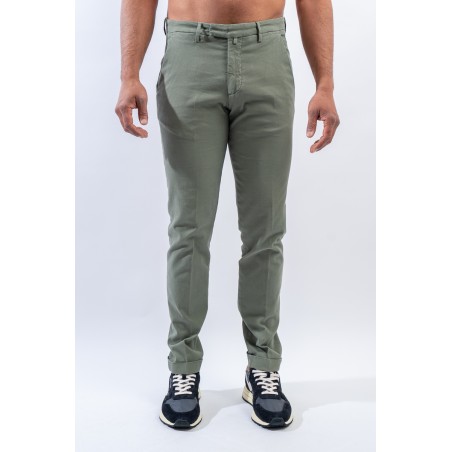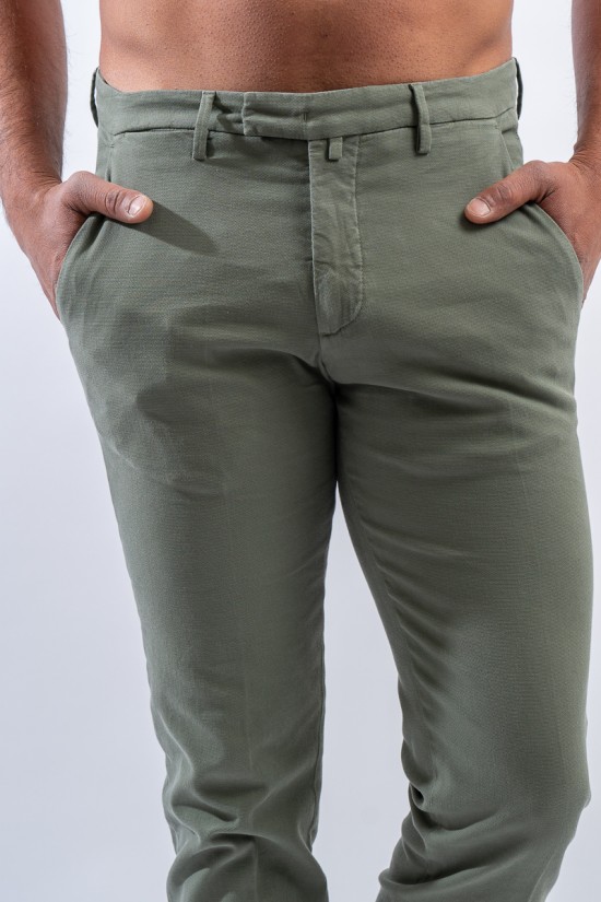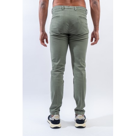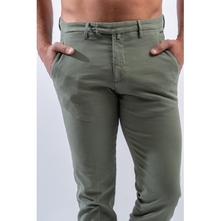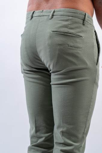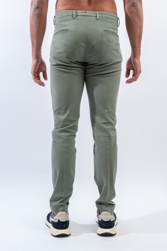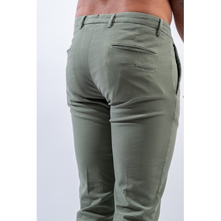 Pantalone Briglia con tasca America dalla vestibilità slim fit. Realizzati in cotone elasticizzato con micro lavorazioni. Presenta tasche verticali sul davanti, tasche orizzontali sul retro e risvolto. Chiusura con doppio bottone e zip. Made in Italy.