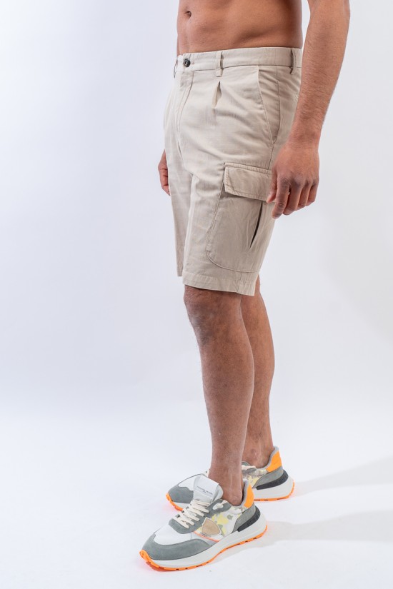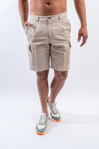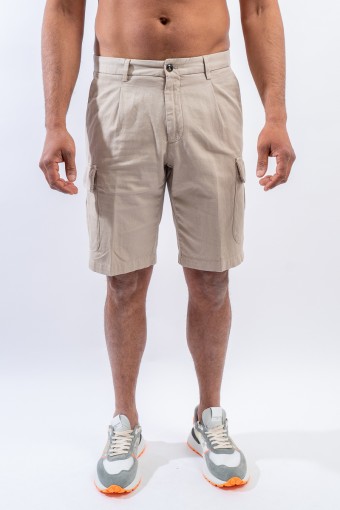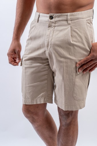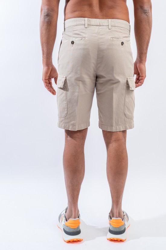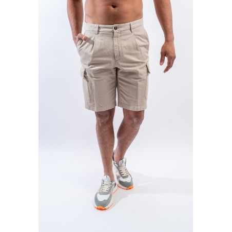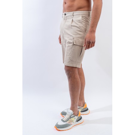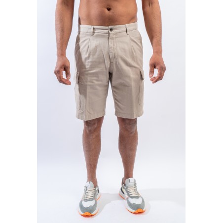 Bermuda cargo firmato Briglia realizzato in misto cotone elasticizzato per donare al capo maggiore libertà di movimento. Presenta tasche laterali a filetto sul davanti e doppie tasche posteriori chiuse da bottoni. Impreziosito dalla vita elasticizzata con coulisse e dalle pratiche e capienti tasche laterali applicate e chiuse da patta e bottoni. Sportivo ma con stile...