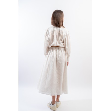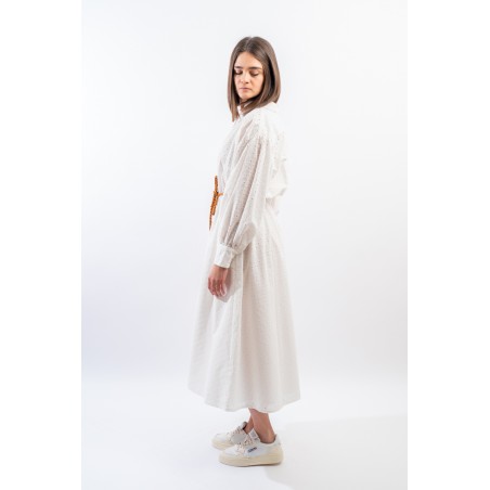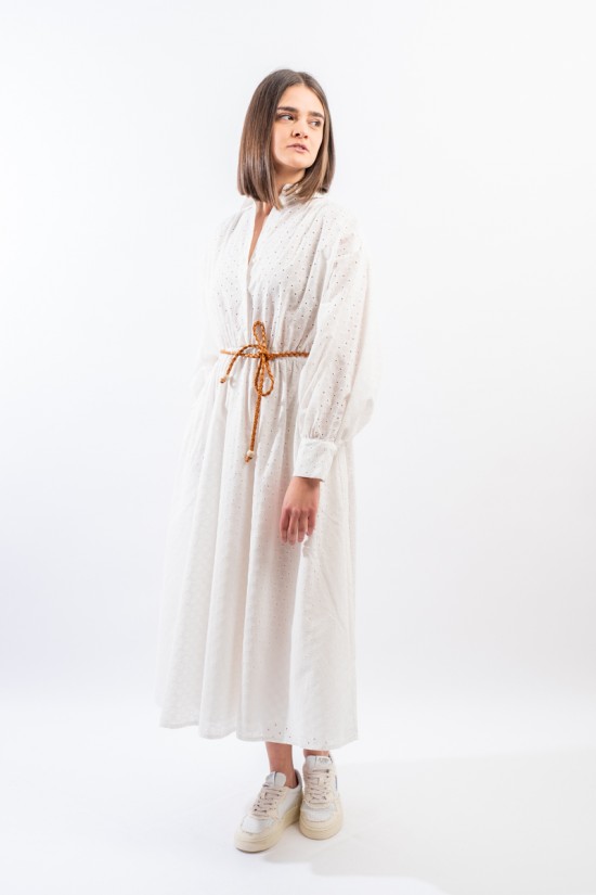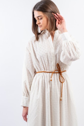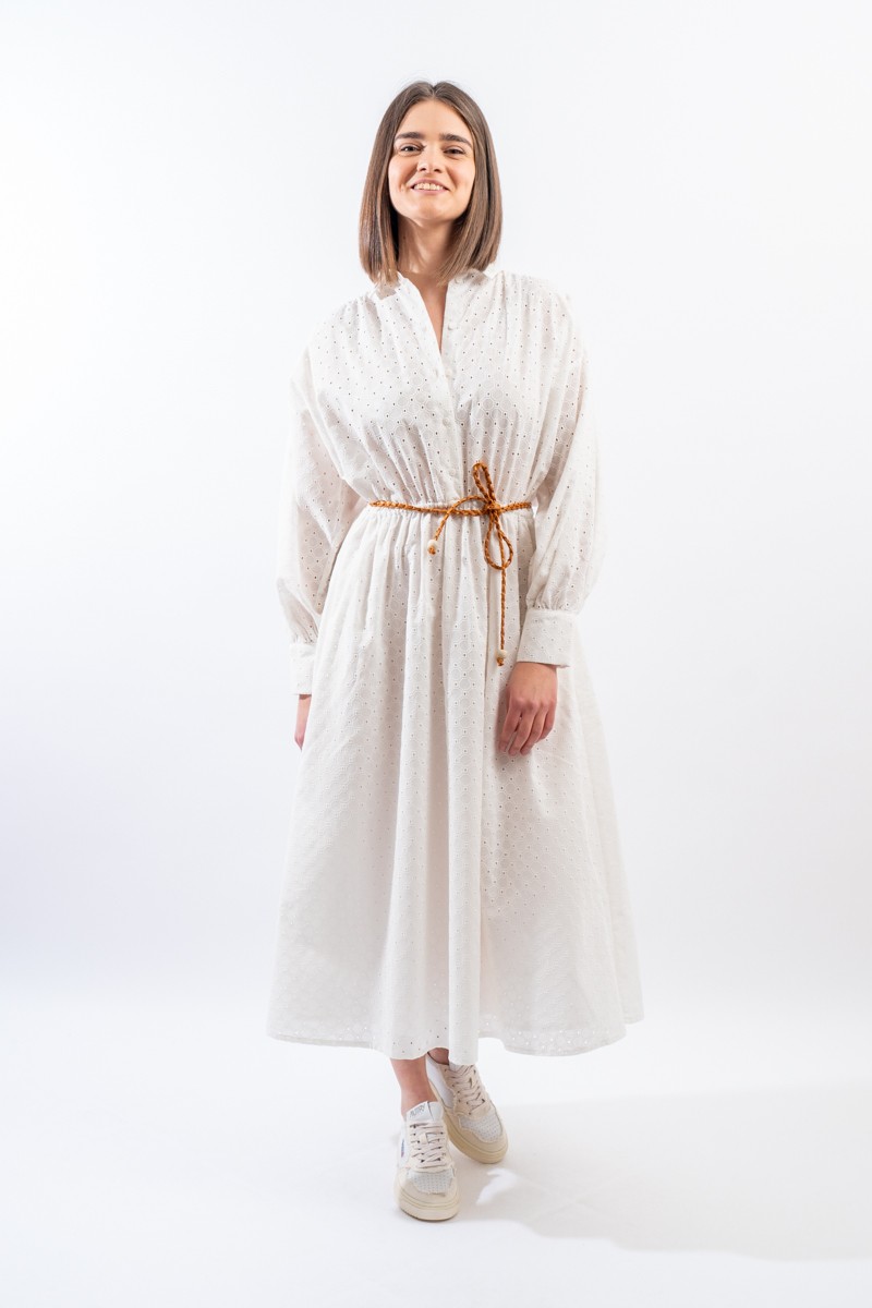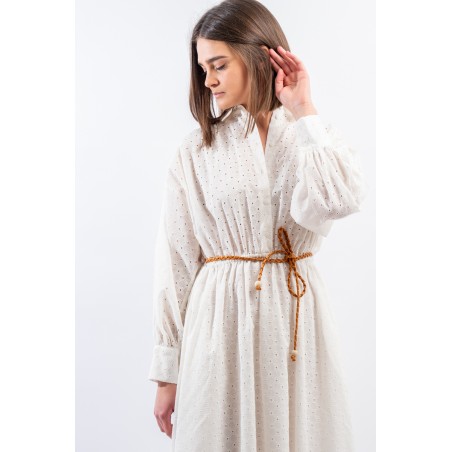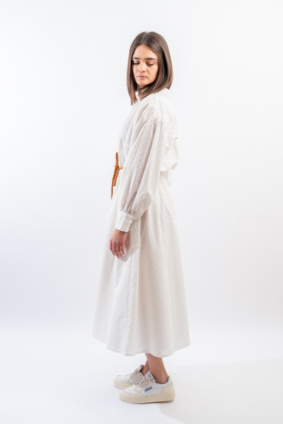 Versatile abito lungo chemiser realizzato in morbido pizzo sangallo di cotone firmato Niu'. Caratterizzato dal collo a camicia, dalla chiusura strategica con bottoni a mezzo busto e dalle maniche lunghe a sbuffo con polsini chiusi da bottone in fondo. Impreziosito in vita da una comoda cintura intrecciata che evidenzia il punto vita e valorizza la silhouette.