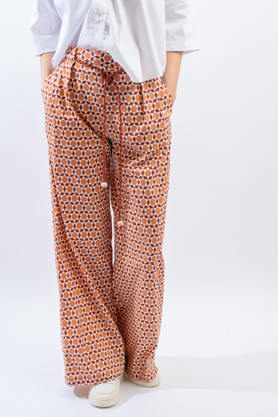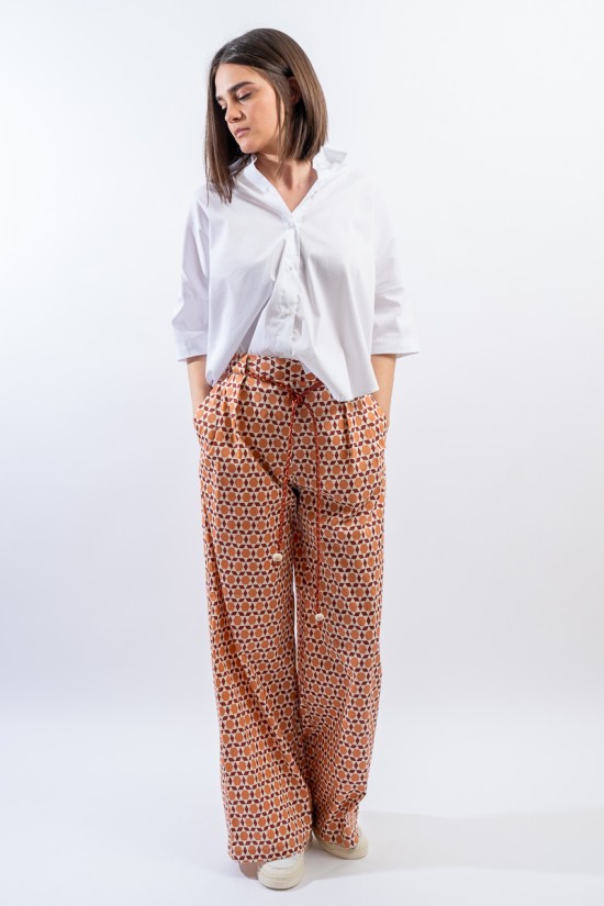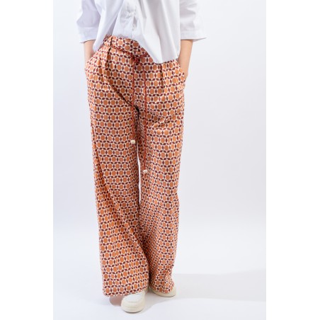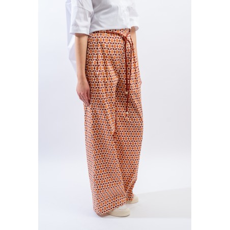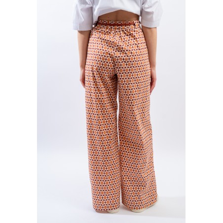 Ampio e morbido si presenta il pantalone a faldoni firmato Niu' realizzato in misto cotone. Caratterizzato dalla gamba diritta e dall'inserto in vita elasticizzato dietro che lo rende estremamente comodo. Impreziosita dalla stampa fantasia all over e dalla cintura regolabile intrecciata in vita. Chiusura con zip a lato e tasche a filetto.